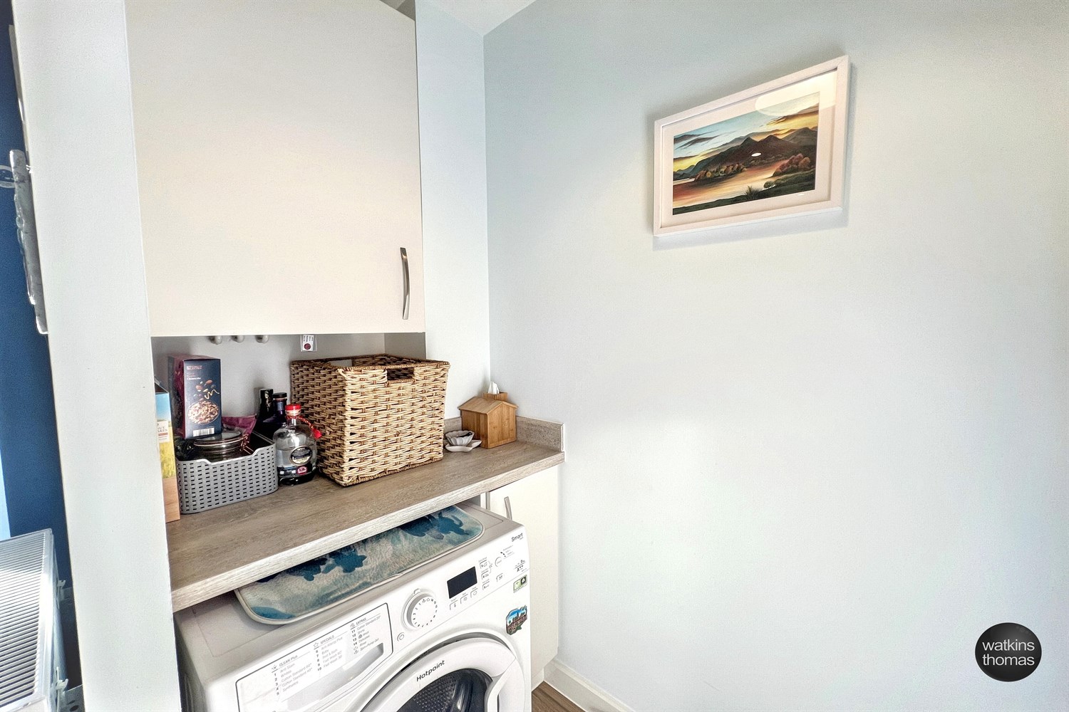 With a fitted working surface having plumbing below for washing machine, cupboard and with a cabinet over in which is housed the wall mounted gas fired boiler which provides central heating and domestic hot water. Door to: