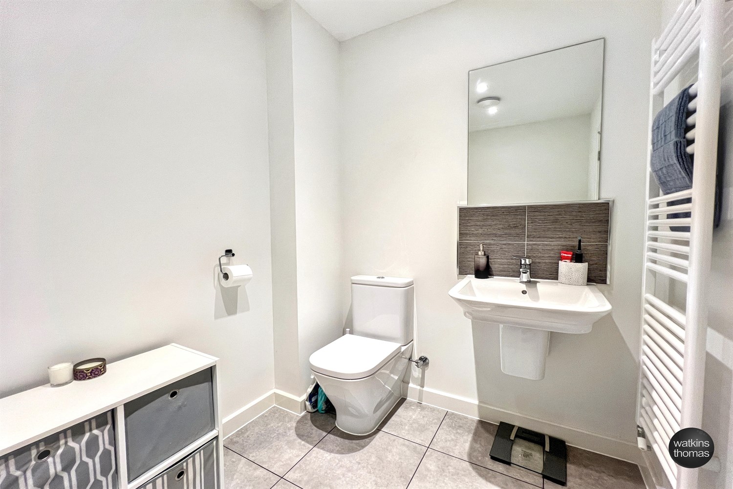 With a low level dual flush wc and wall hung wash basin with tiled courses over, radiator and with a continuation of the wood grain effect flooring.