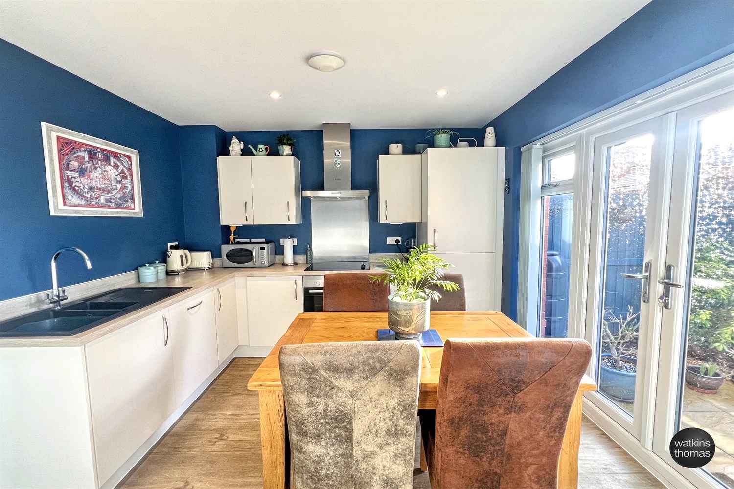With a pair of double glazed French doors opening to and overlooking the rear garden with adjacent double glazed windows. Sunken ceiling lights, wood grain effect flooring and with fitted soft close base cupboard and drawer units with wood grain effect working surface over, upstand and a double and single eye level cabinet together with a built-in matching fridge and freezer unit, integrated dishwasher, built-in electric oven with a four ring hob over, stainless steel splash back and stainless steel cooker hood together with a 1? bowl composite sink unit with drainer and mixer tap. Radiator and with an opening to a: