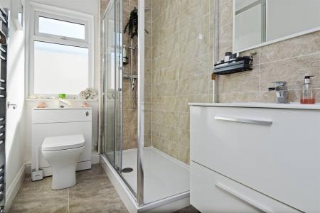 Suite in white comprising large double fully tiled shower cubicle, wash hand basin set into vanity unit and close coupled WC. Chrome heated towel rail. Partially tiled walls. Frosted window to rear. Tiled flooring. Extractor fan.