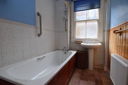 Suite in white comprising panelled bath with shower unit over bath and pedestal wash hand basin. Radiator. Partially tiled walls. Frosted window to side.