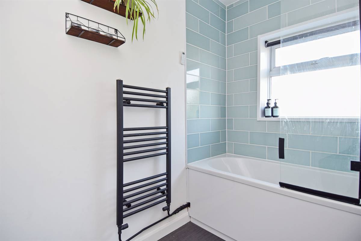 Suite in white comprising panelled bath with shower unit over bath and screen to side, wash hand basin set into vanity unit and close coupled WC. Heated towel rail. Partially tiled walls. Frosted window to rear.