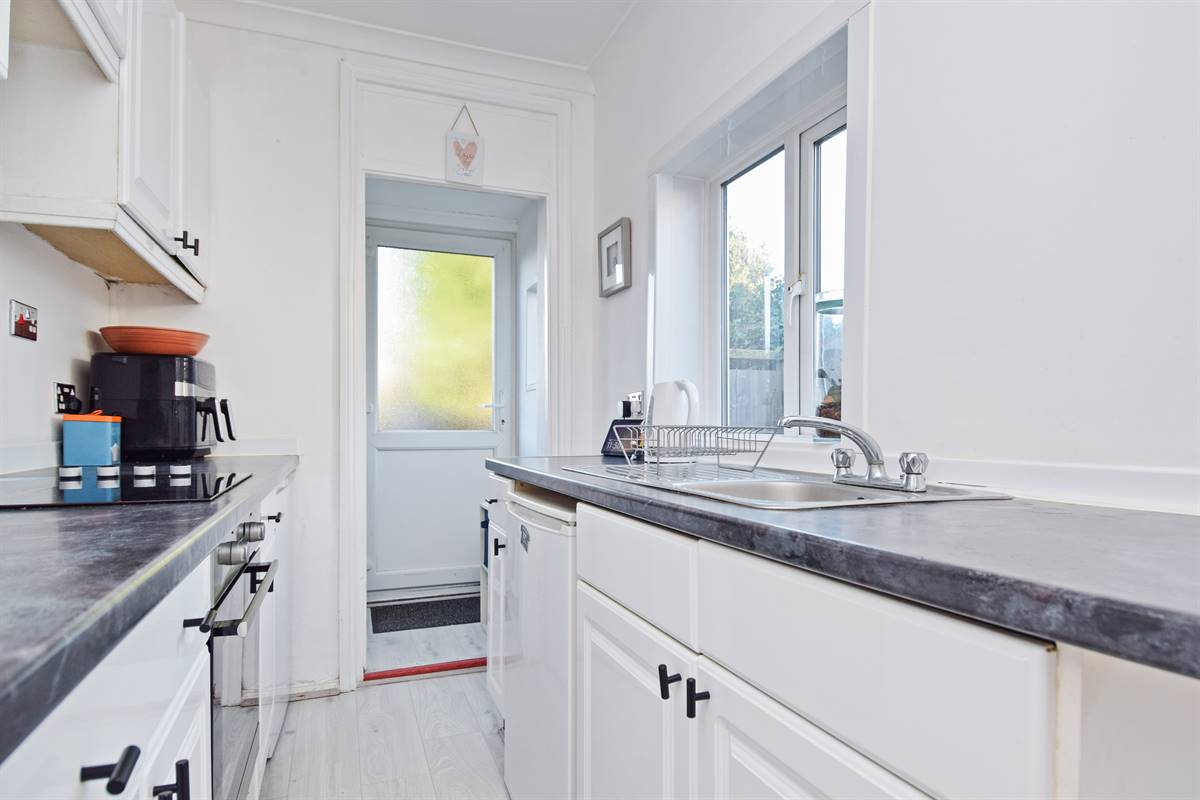 Range of matching wall and base units. Work surfaces. Power points. Windows to side and rear overlooking rear garden. Door to rear garden.
