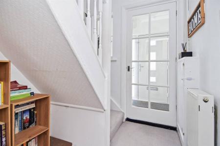 Double glazed painted wood front entrance door. Radiator. Balustrade staircase leading to first floor.