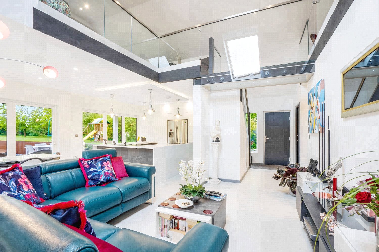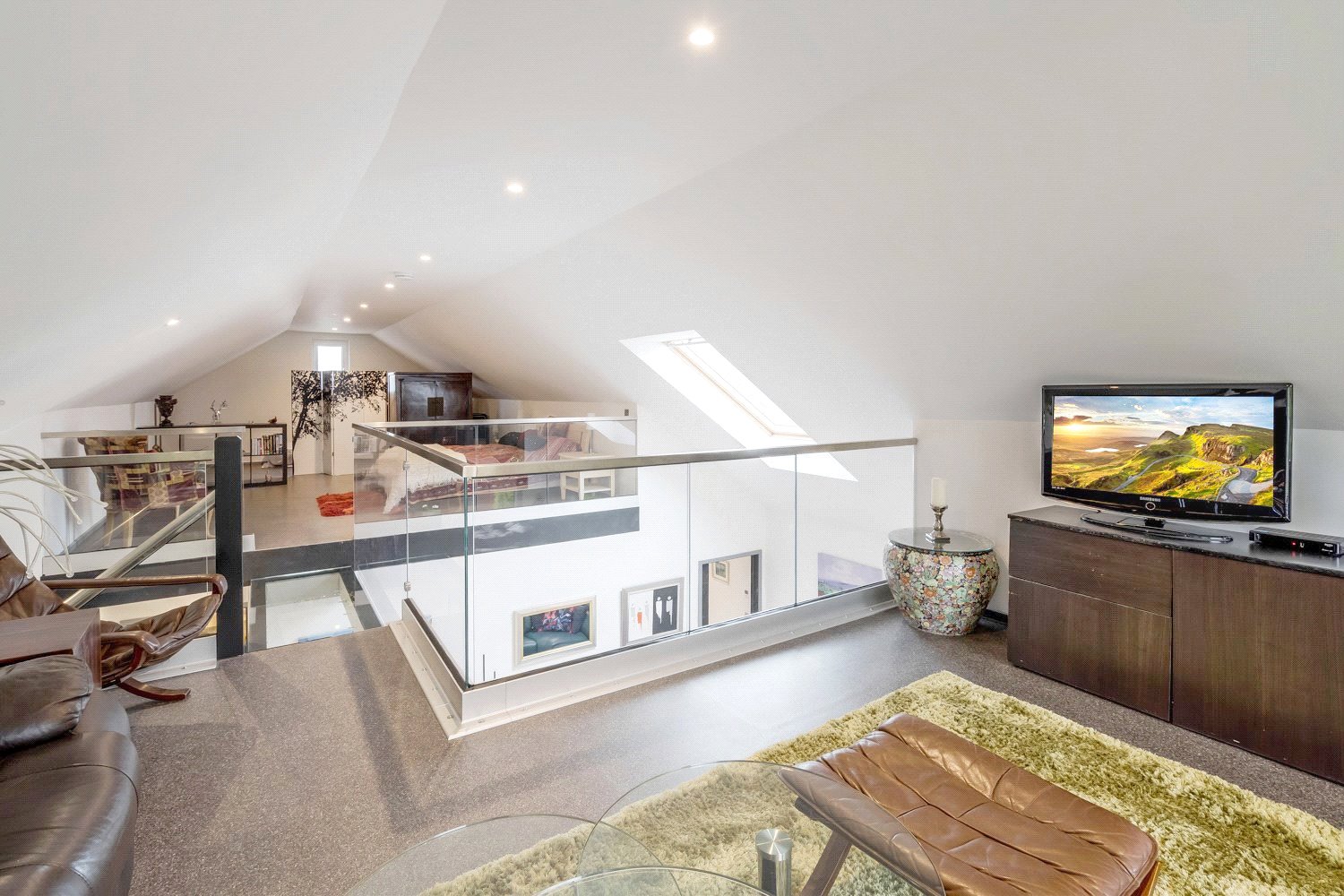 FIRST FLOOR ACCOMMODATION: From the main reception hall there is a bespoke staircase that leads up to the fabulous feature architect designed glass and chrome first floor landing that is suspended within the vaulted area with matching glass and chrome sides between a study and the further snug reception area with its own outside balcony.