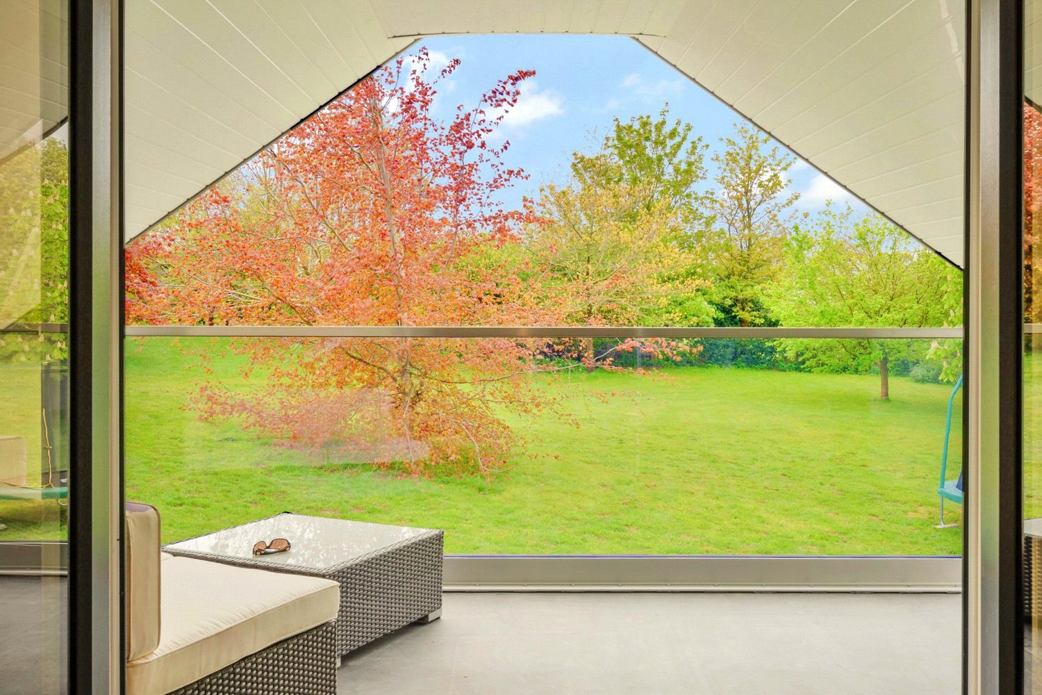 COVERED SUN TERRACE BALCONY FROM SNUG ROOM / POTENTIAL BEDROOM FOUR: Comprising of rubberised hardwearing flooring with slatted high gloss weatherboarded ceiling with low energy led outside downlights, heavy glazed and chrome balcony with wonderful southerly aspect over the landscaped park style gardens.