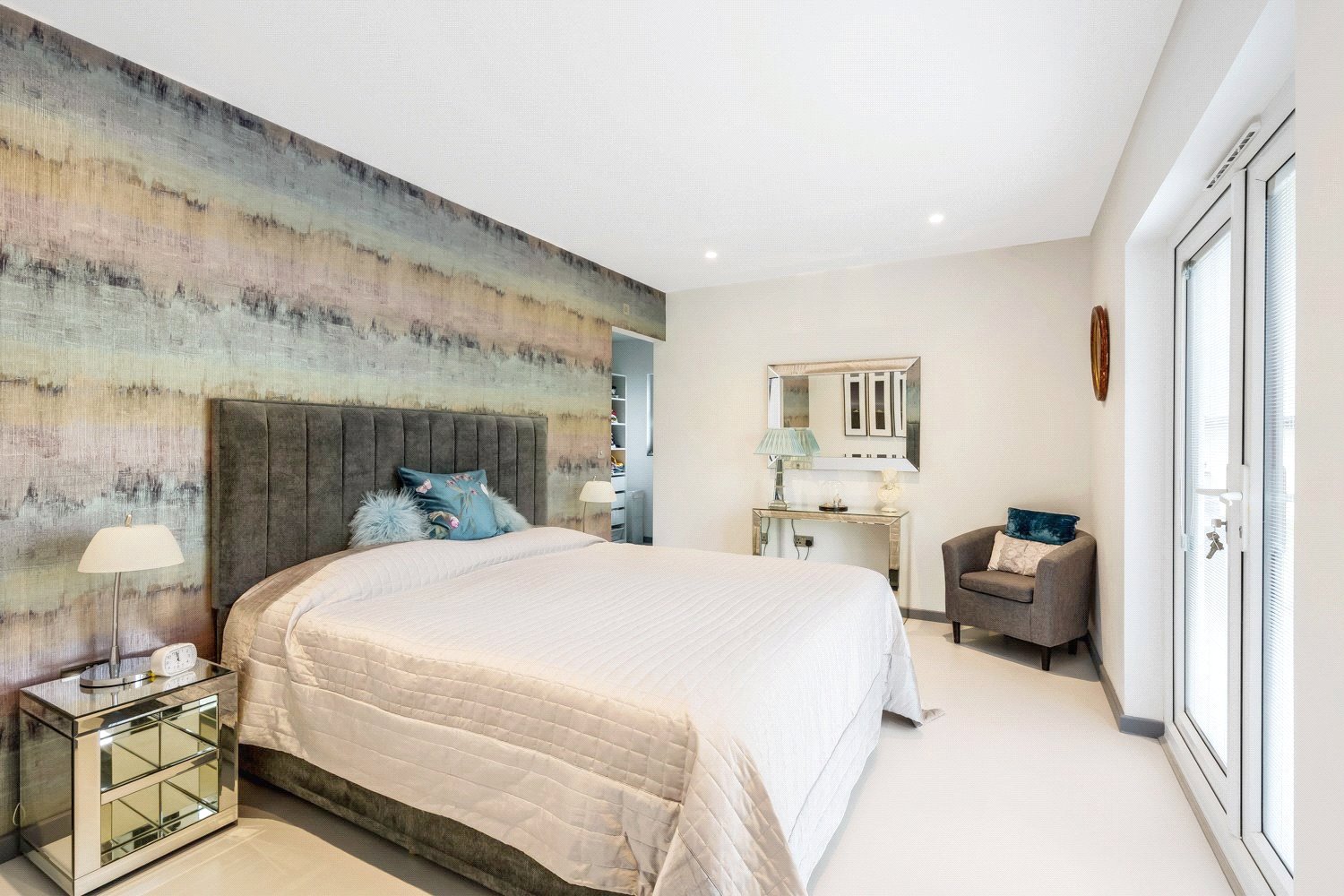 BEDROOM ONE MAIN BEDROOM SUITE: Comprising of a double bedroom, walk in dressing room and luxury ensuite shower room. The main double sized bedroom is approached from the open plan sitting room via a bespoke modern sliding and pocket door, with poured resin flooring with underfloor heating, low energy led down lighting, feature decorative wall, numerous brushed steel power points, wall point control for individual thermostatic control for room temperature, impressive full height bespoke double-glazed doors and window with internal Italian blinds that have a wonderful easterly aspect over the beautiful landscaped park gardens and open out onto the large sun terrace. Archway leading to the generous sized adjoining walk-in dressing room.