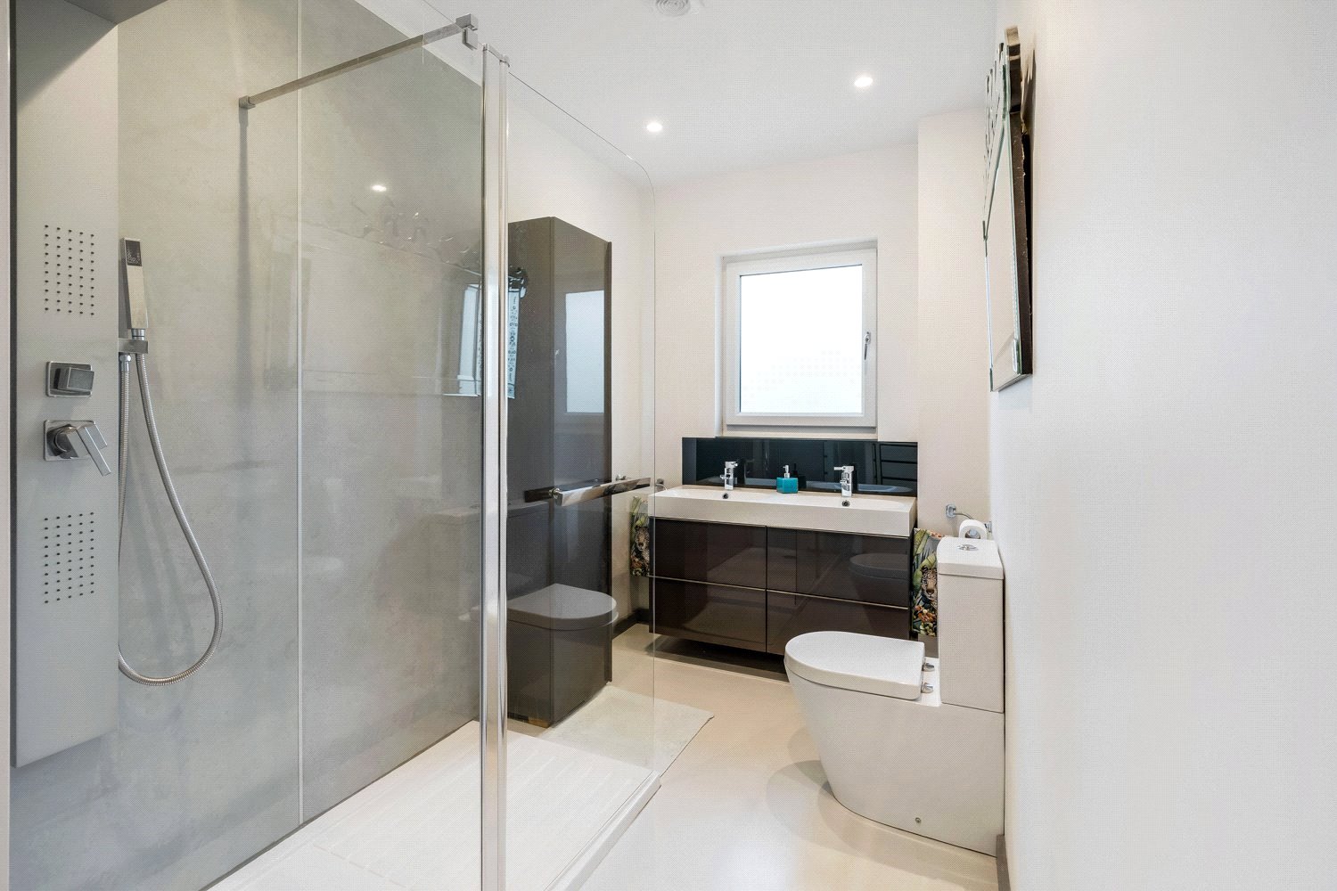 ENSUITE SHOWER ROOM TO BEDROOM TWO: With poured resin floor with underfloor heating, heavy glazed and chrome fronted double sized shower with chrome feature shower head and shower control system, feature colour aqua board walls, Victoria Plumb W.C., ceramic sink unit with chrome tap and high gloss vanity unit under, double glazed frosted tilt and turn window with glass windowsill.