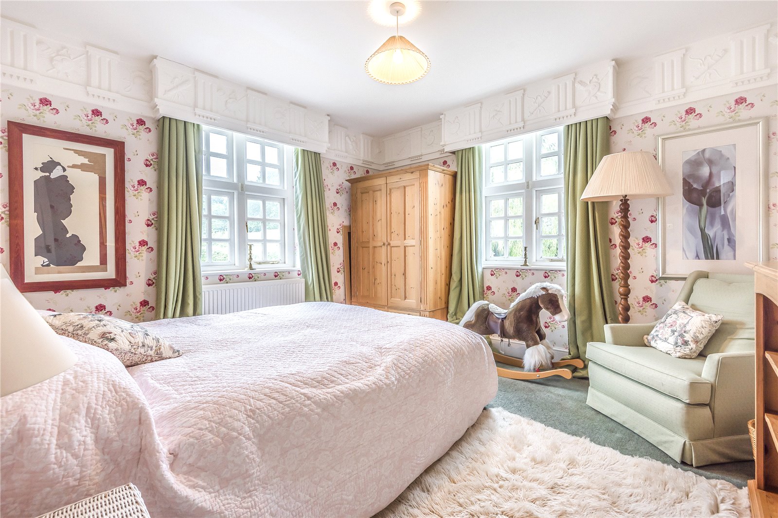 BEDROOM WITH SEMI EN-SUITE BATHROOM / SHOWER ROOM: Approached from inner hall off the galleried landing. A double bedroom and double sized room, with radiator, attractive double glazed paned wooden windows with aspect over front and side gardens.