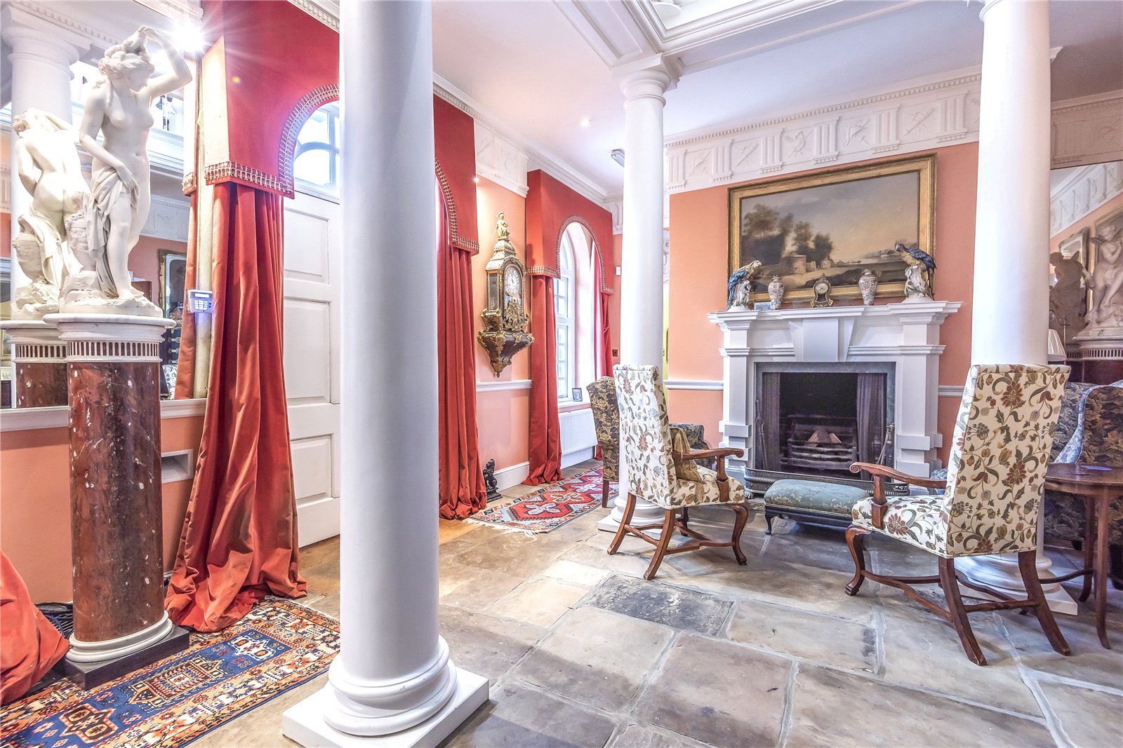 MAIN ENTRANCE AND RECEPTION HALL: With a continuation of further neoclassical pillars supporting a beautiful galleried landing, impressive paved stone flooring, imposing open fireplace, carved dado rails, elegant neoclassical coving and frieze, radiator, attractive double glazed paned windows with aspect to front. Archway continuing to an open plan inner hall area leading to further downstairs areas.