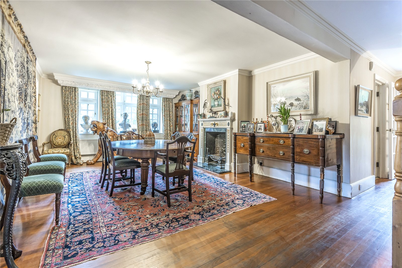 DINING ROOM: A large elegant room with wonderful wooden floors, coved ceilings, a large open fireplace in the Adam style with marble insert and hearth, radiators, attractive double glazed paned wooden windows with aspect to the side gardens.