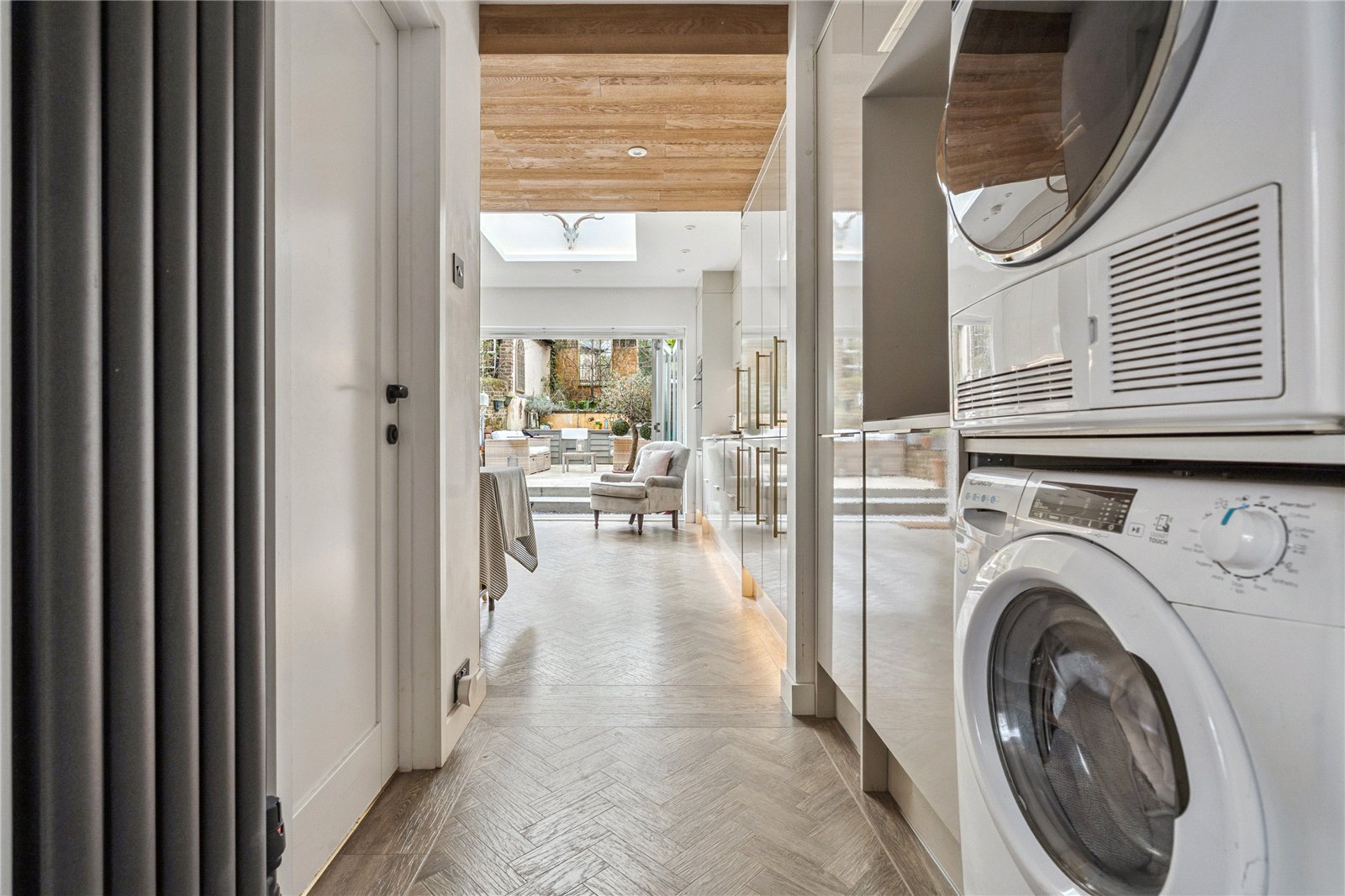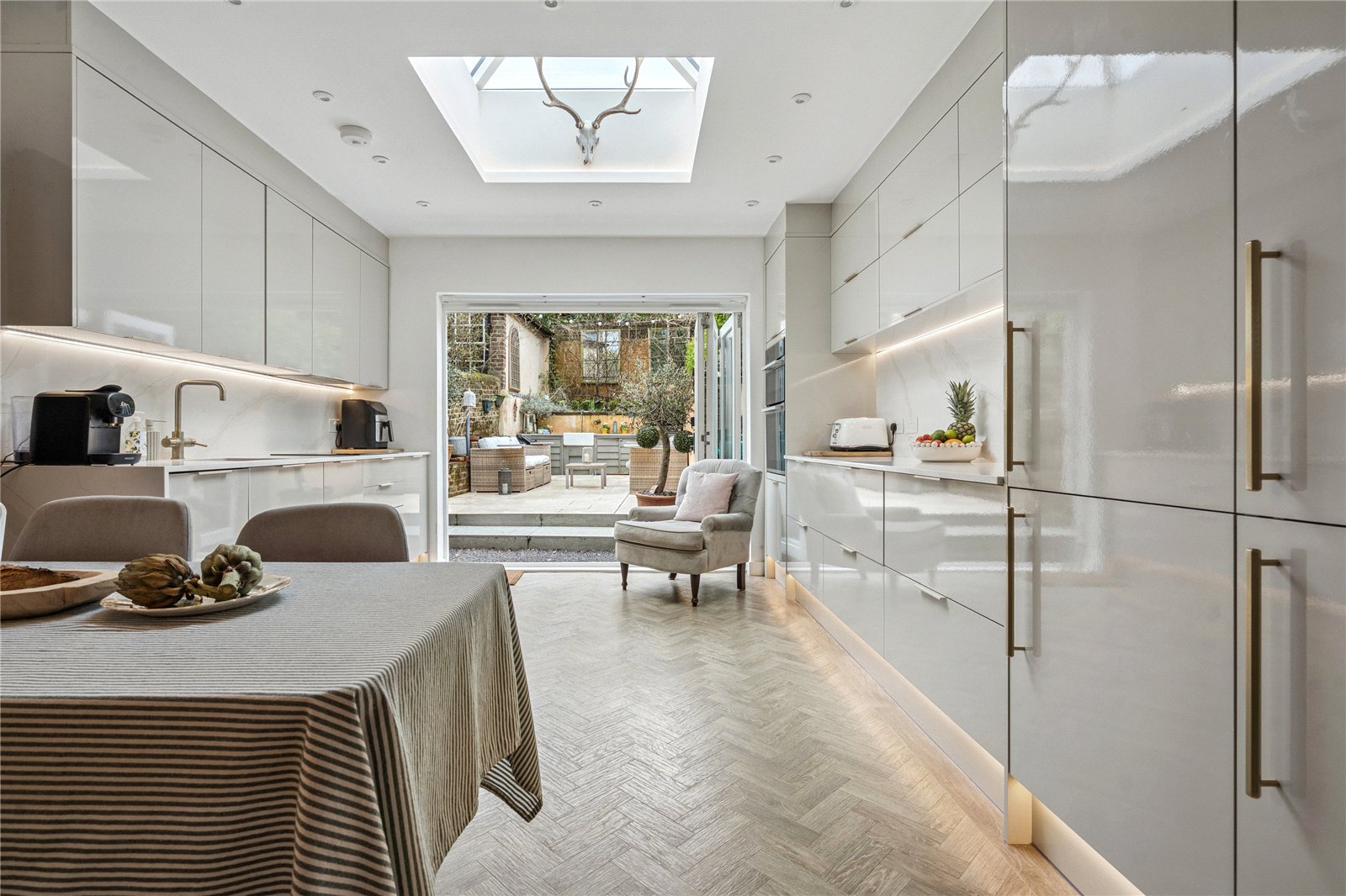 Step inside and be greeted by impressively high ceilings, feature fireplaces, and classic sash windows which flood the rooms with natural light and accentuate the sense of space. The sitting room and family room offer flexible, inviting spaces to relax or entertain. At the rear, a stunning kitchen and dining space is truly the heart of the home, designed with the modern family in mind. This contemporary kitchen features sleek cabinetry, expansive bi-fold doors opening onto the courtyard garden, and a roof lantern overhead, seamlessly connecting the indoor space to the outdoors.