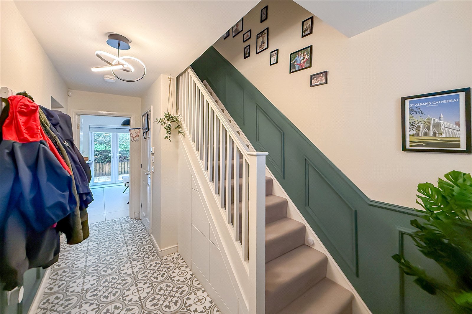 Tucked away in a peaceful cul-de-sac location, this attractive three-bedroom semi-detached townhouse offers modern, well-balanced accommodation of approximately 1,250 sq. ft., with versatile living spaces arranged across three floors. Thoughtfully decorated with a contemporary finish throughout, the property also benefits from driveway parking and an enclosed rear garden, making it an ideal choice for families and professionals alike.A welcoming entrance hall provides access to the ground floor accommodation, which includes a family room, a convenient W/C, and useful understair storage. To the rear lies the impressive kitchen/dining room, fitted with ample cupboard space and featuring direct access to the gardenperfect for everyday living and entertaining.The first floor hosts a bright and spacious living room, creating a relaxed space for family gatherings, along with the principal bedroom, which includes a built-in storage cupboard and a stylish en suite shower room. Stairs rise again to the second floor, where there are two further bedrooms: bedroom two featuring built-in wardrobes and eaves storage, and bedroom three, both served by a modern family bathroom.The rear garden is arranged over two levels, beginning with a paved patio area ideal for outdoor dining, with steps leading up to an artificial lawn offering a low-maintenance, private setting. To the front, there is off-street parking and access to the converted garage, now offering additional flexibility for storage, work, or recreation.Ideally positioned within easy reach of highly regarded schools, local shops, and St Albans city centre, the property also benefits from convenient access to the mainline station, providing quick connections into London St Pancras. Combining space, comfort, and a desirable location, Neville Close represents an exceptional opportunity to secure a modern family home in a sought-after setting.