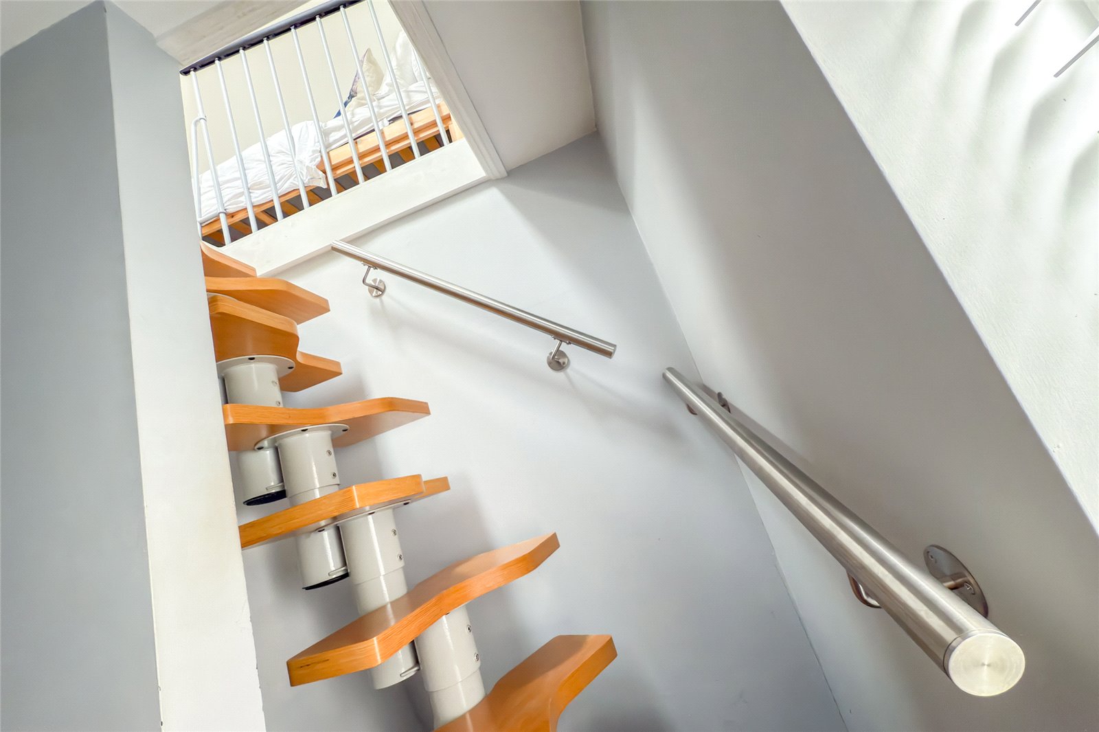 From the hallway, a spiral staircase rises to a loft area, a wonderfully flexible space that could be used as a home office, hobby area, or occasional guest space, depending on your needs.