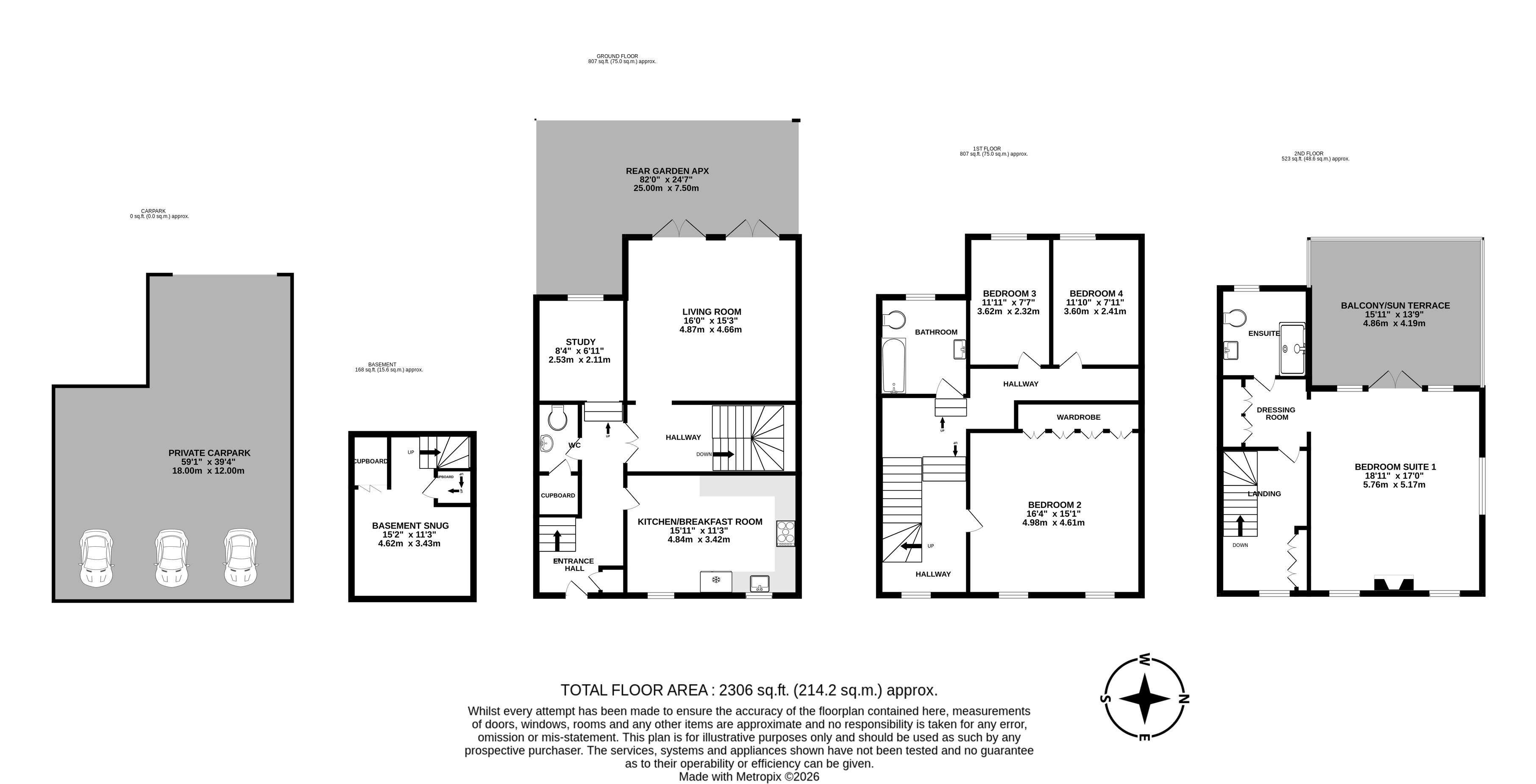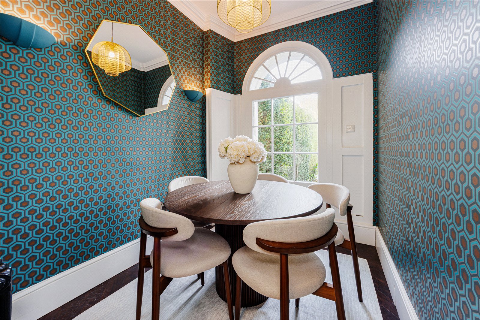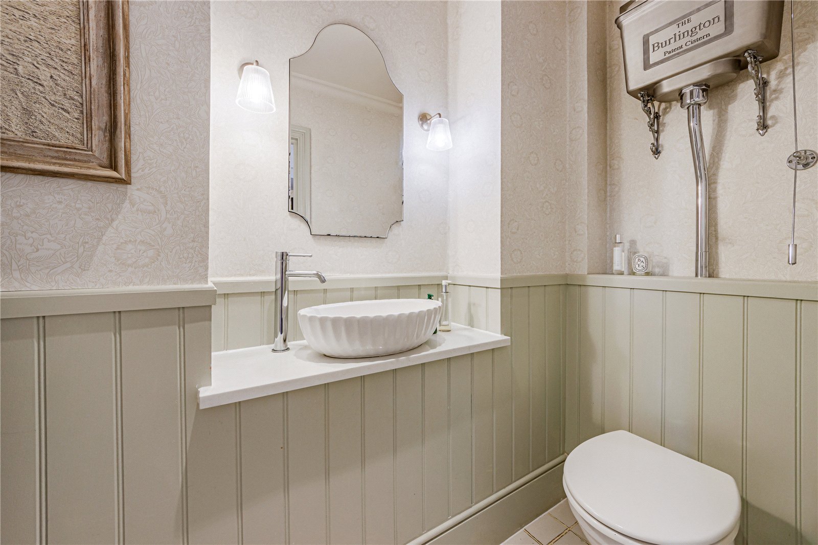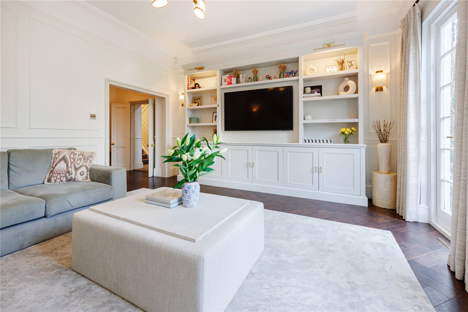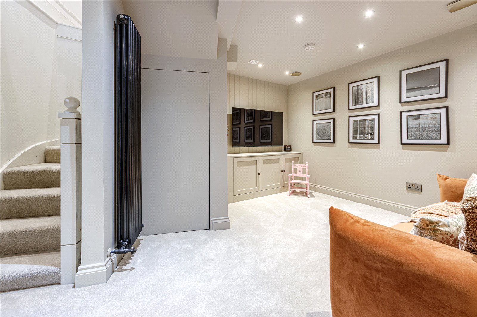 The ground floor is designed with both everyday living and entertaining in mind. A welcoming entrance hall leads through to a spacious kitchen and breakfast room, forming the heart of the home, with ample room for informal dining and family life. From here, the layout flows naturally into a bright and generously proportioned living room overlooking the rear garden, creating a comfortable and inviting principal reception space. A separate study provides an ideal work-from-home environment or flexible additional reception room, while a convenient cloakroom completes the ground floor accommodation. The property also benefits from a useful basement snug, offering further versatility as a cinema room, playroom or quiet retreat.