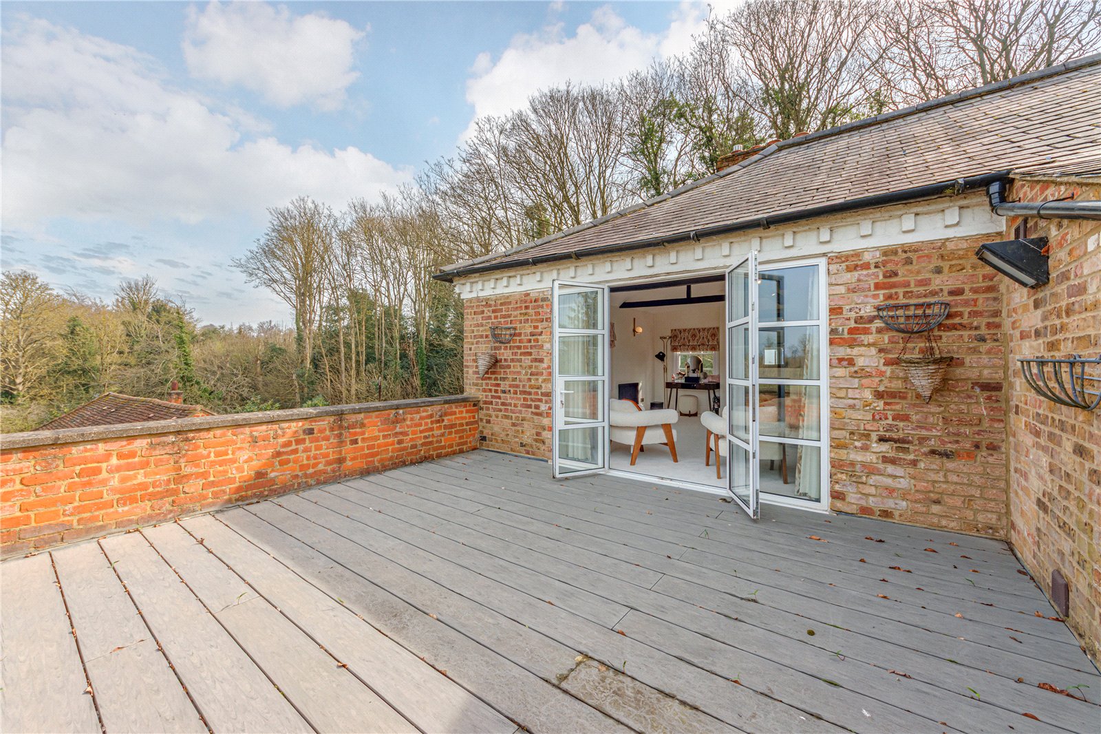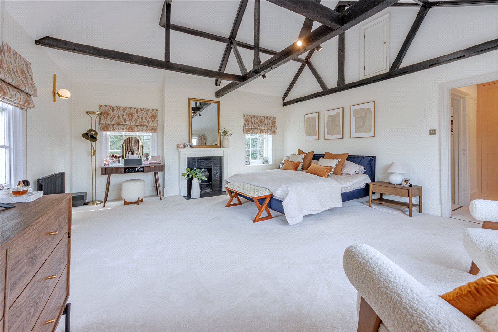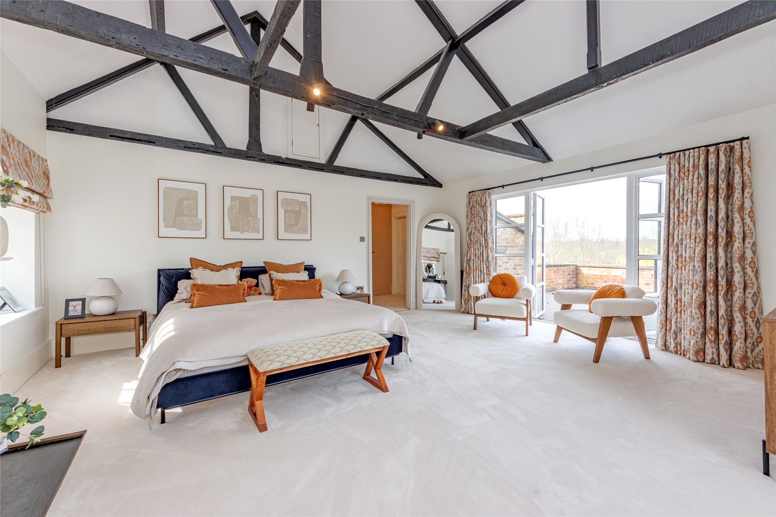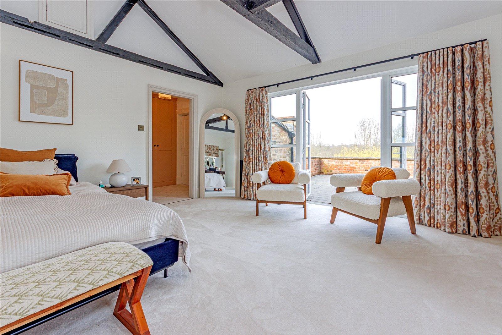 Occupying the upper level, the principal bedroom suite provides an impressive and private sanctuary. The generous bedroom is complemented by a dedicated dressing room and ensuite facilities, while double doors open onto a substantial balcony terrace. This elevated outdoor space enjoys far-reaching views over the surrounding gardens and countryside, creating an ideal setting for morning coffee or evening relaxation.