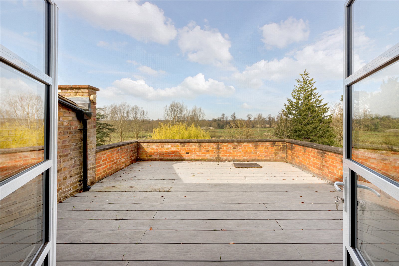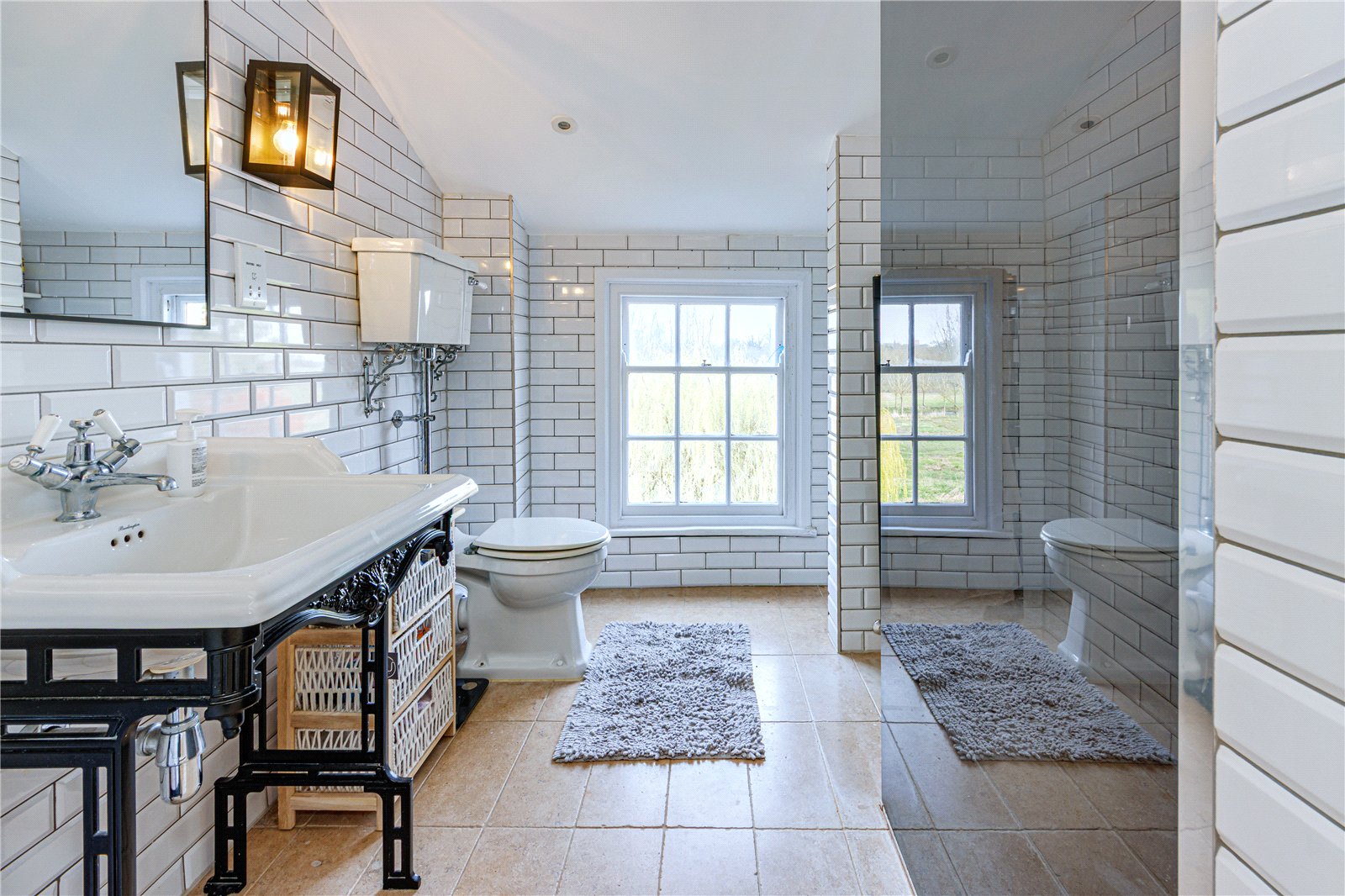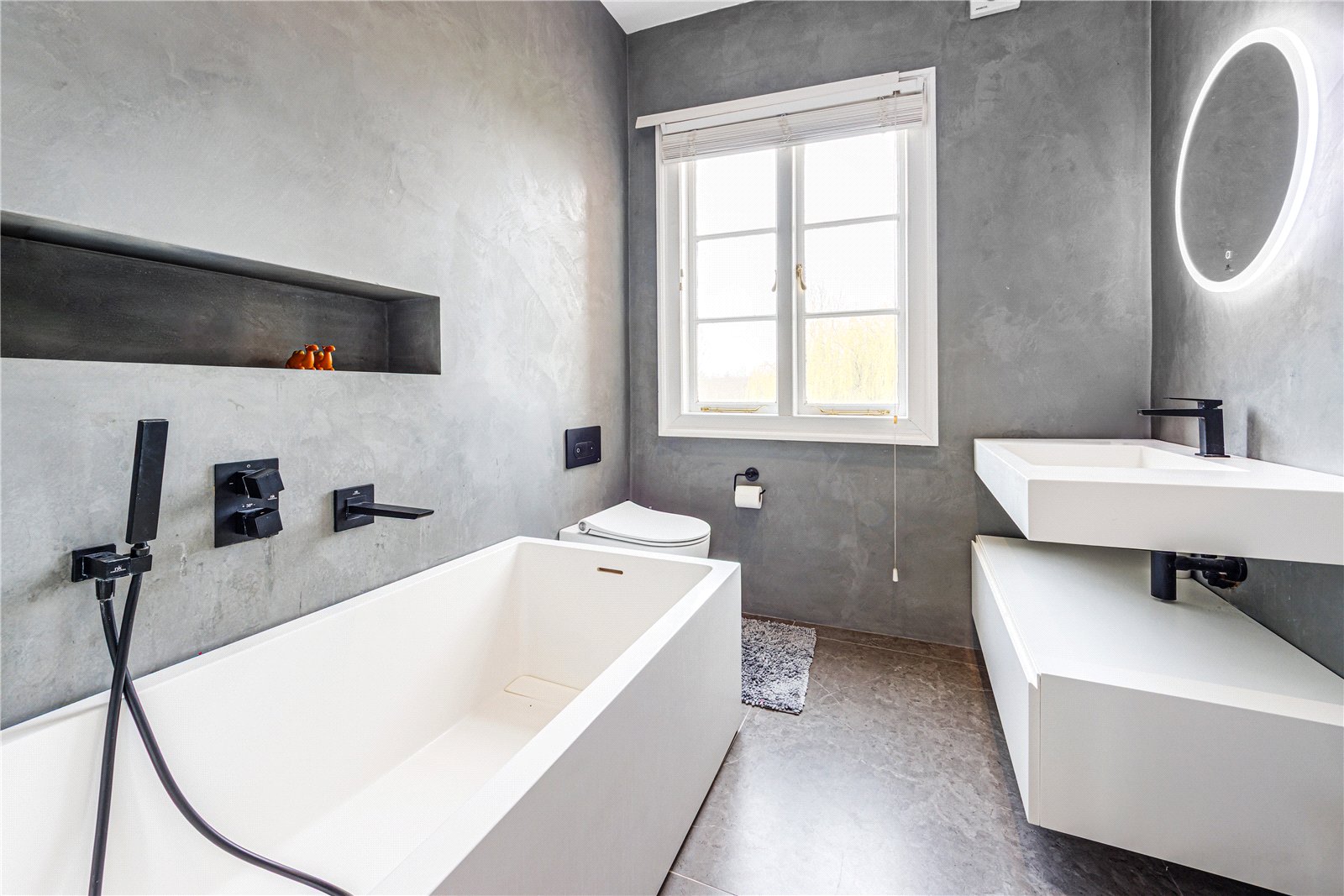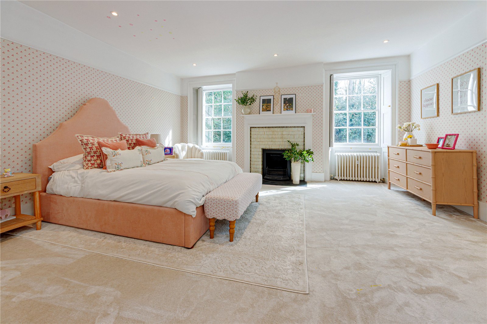 Occupying the upper level, the principal bedroom suite provides an impressive and private sanctuary. The generous bedroom is complemented by a dedicated dressing room and ensuite facilities, while double doors open onto a substantial balcony terrace. This elevated outdoor space enjoys far-reaching views over the surrounding gardens and countryside, creating an ideal setting for morning coffee or evening relaxation.