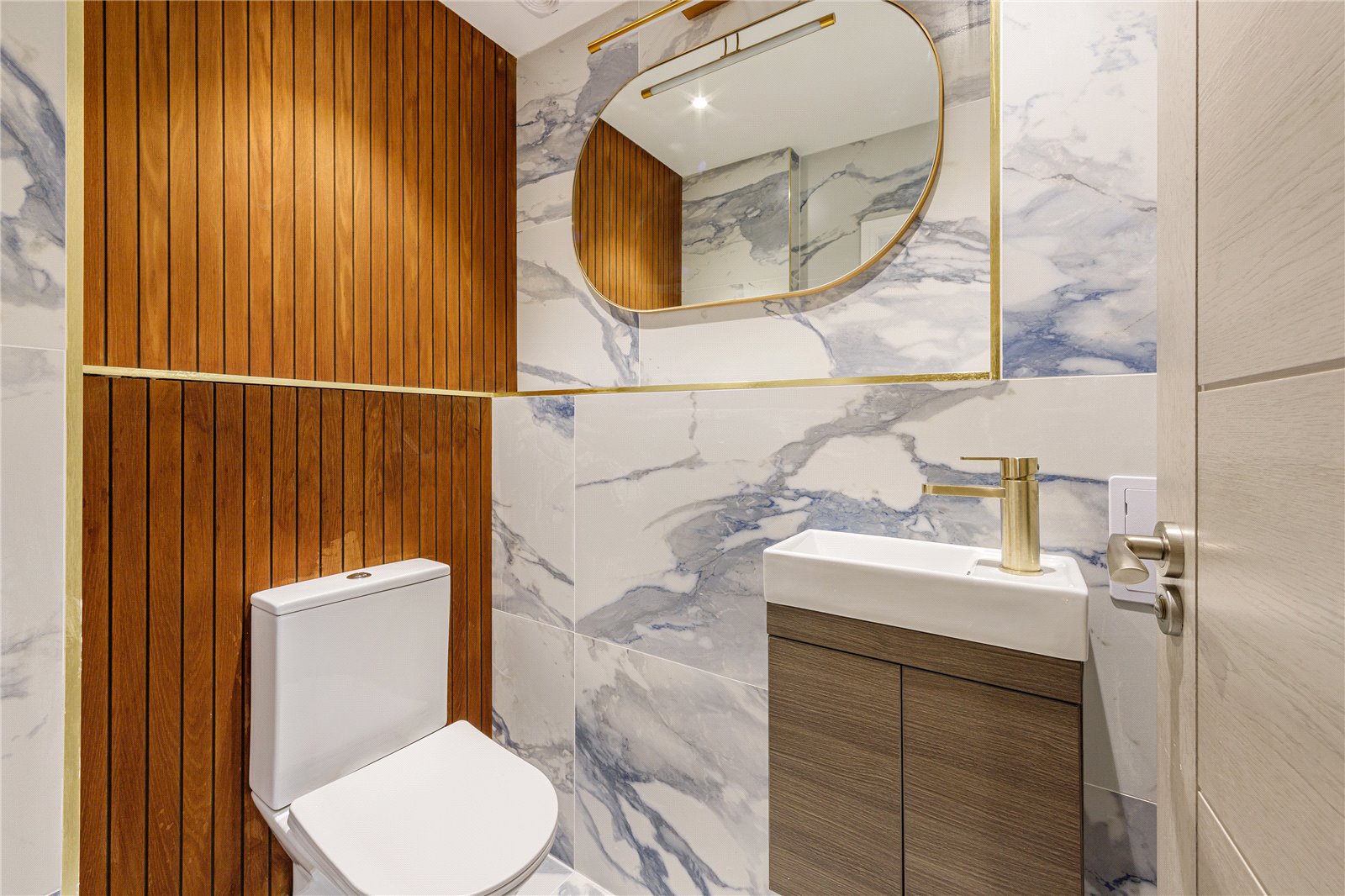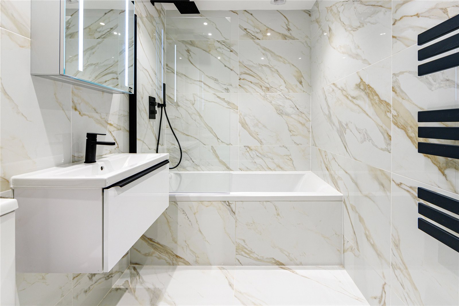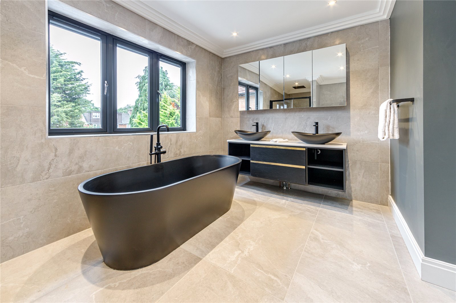 To the first floor, this consists of the generously sized master bedroom, a walk-in wardrobe fully equipped with built-in storage and a luxurious master en suite complimented by Italian tiling, a free-standing bath, walk in shower and a double vanity sink, underfloor heating also equipped. The second bedroom is also fitted with walk in wardrobes. The family bathroom is located to this floor, is also fitted with Italian tiling throughout with a panelled bath, vanity wash hand basin and underfloor heating.