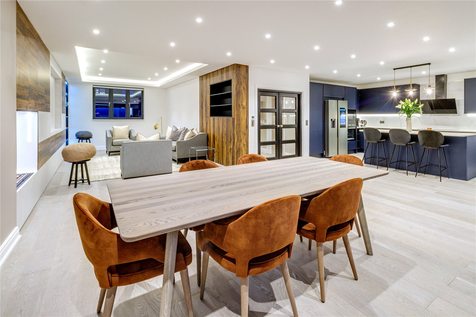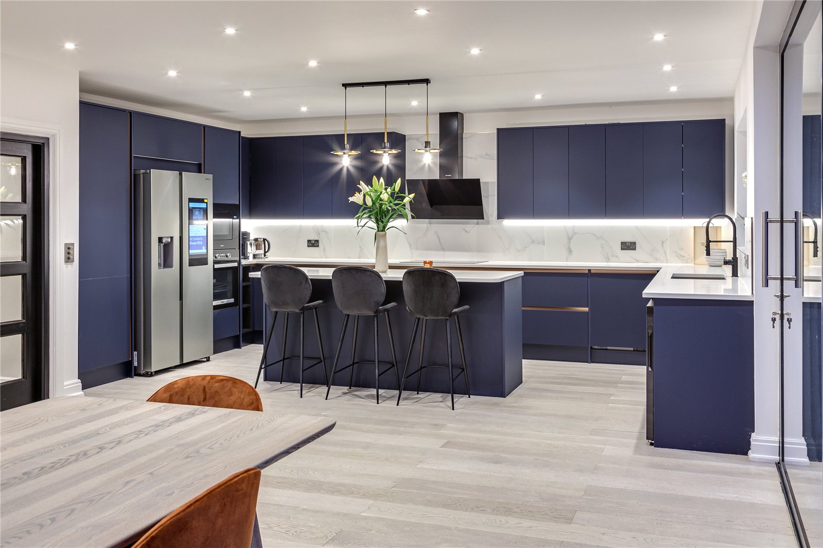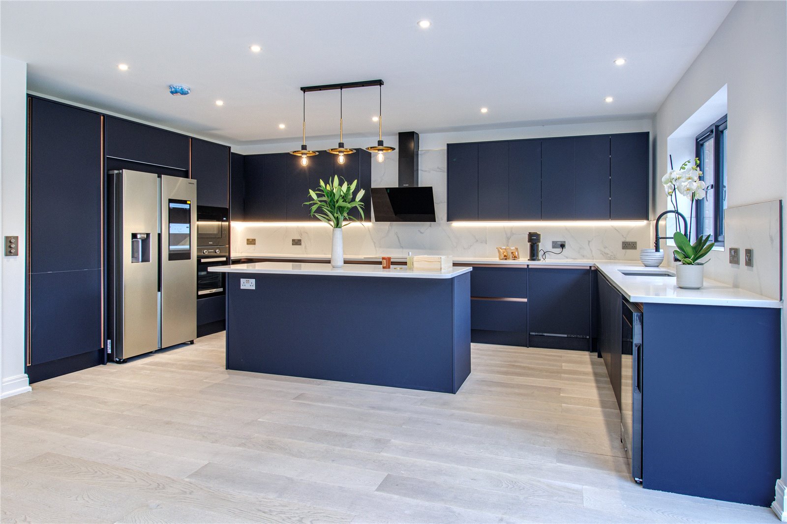 Upon entering this home, you are welcomed by the entrance hall leading on to the ground floor bedroom with Italian tiled en suite with underfloor heating, and then led onto the expansive open plan kitchen diner fitted with refined quartz worktops, kitchen island and Miele appliances. The kitchen and dining area then flows into the family living room, a great space fitted with a large media unit and bio ethanol fireplace. The garden can be accessed via anthracite sliding patio doors. The entire ground floor of this home is fitted with underfloor heating as well as the bathrooms within the property.