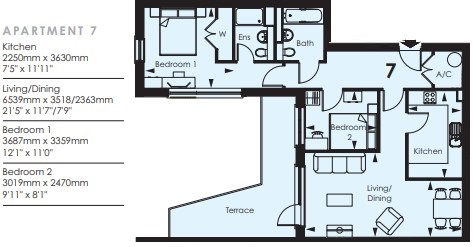 The apartment is complemented by a unique, internal terrace with power and large seating area.