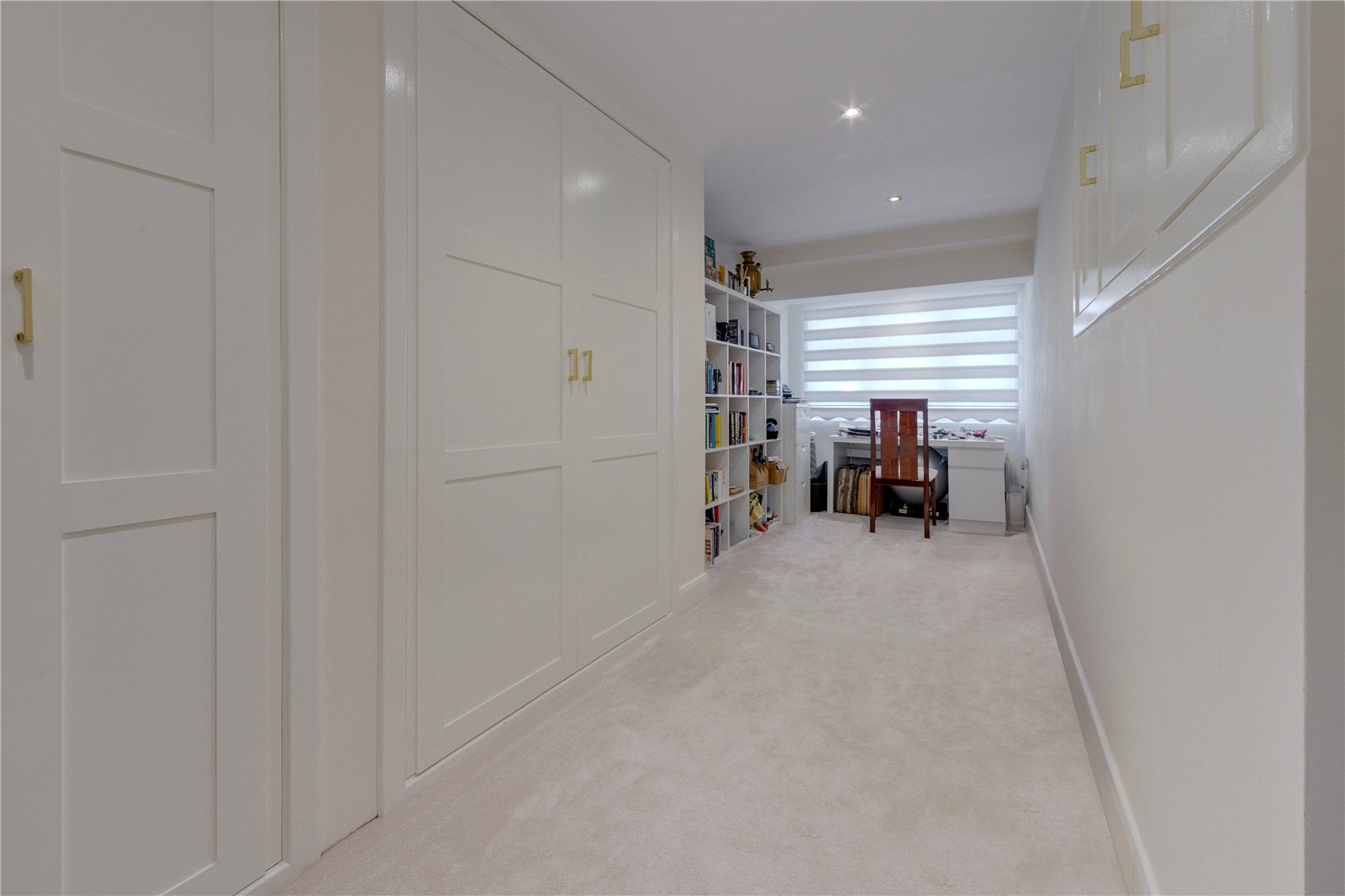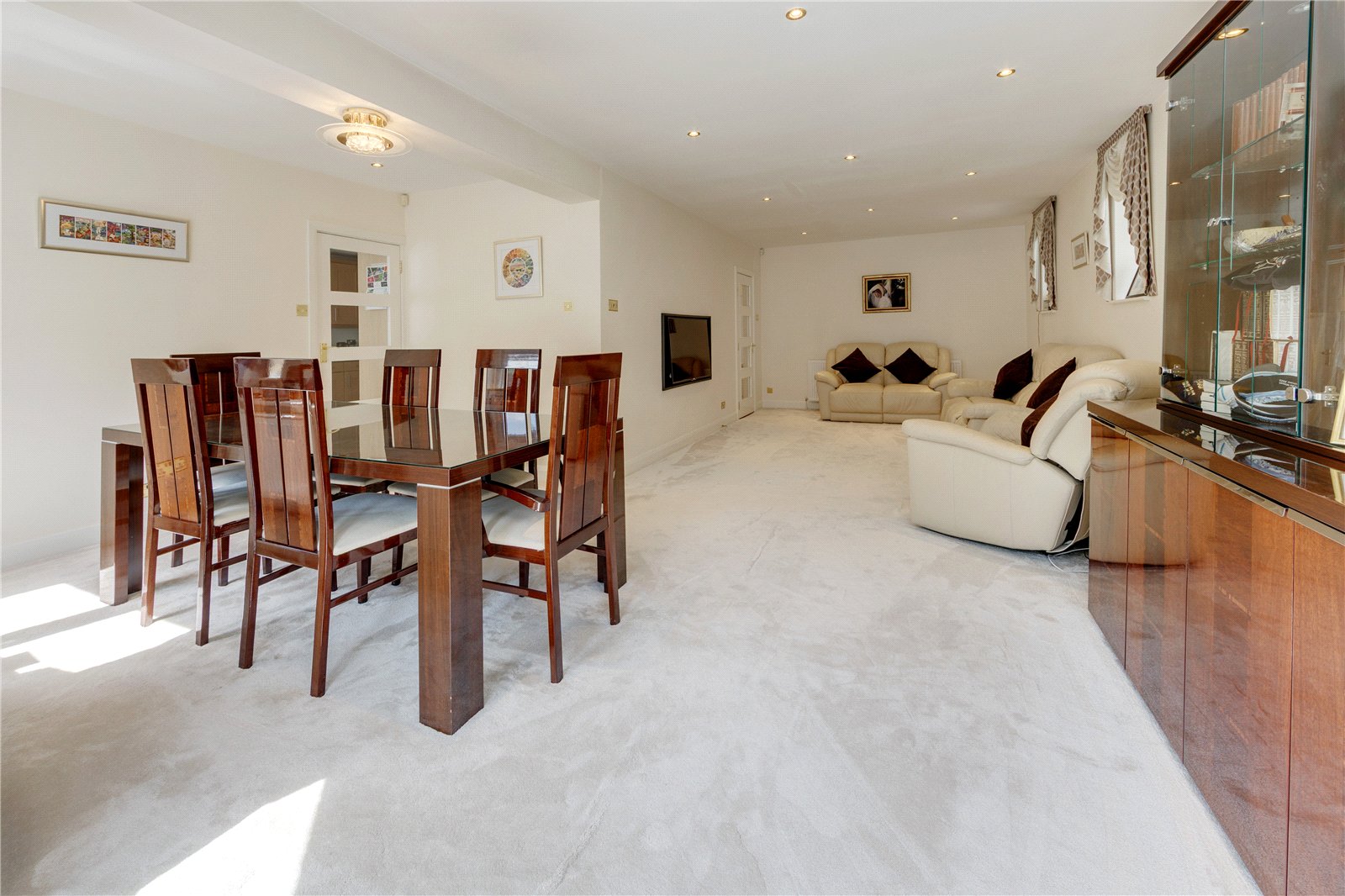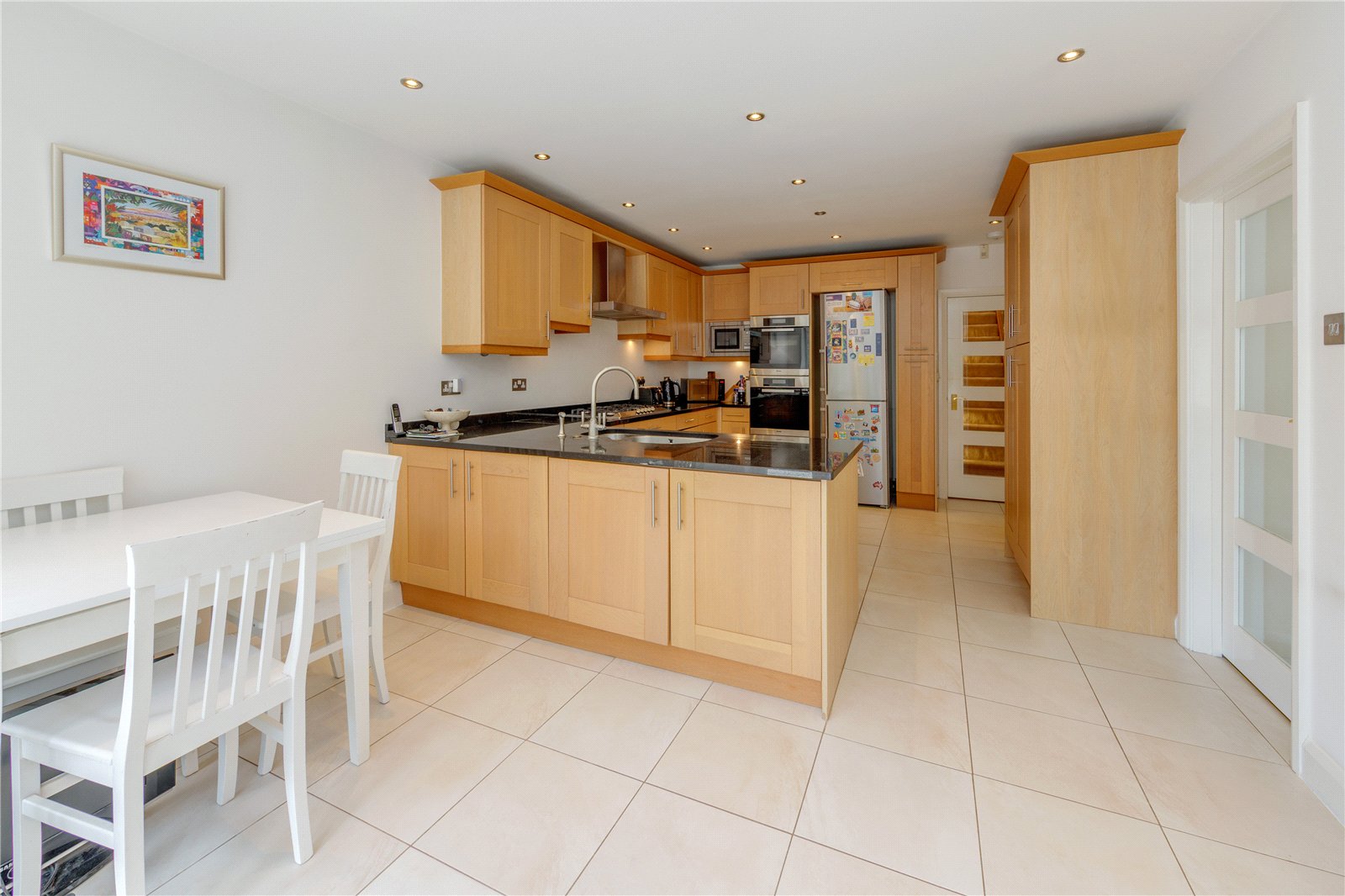 The ground floor presents an inviting and thoughtfully arranged layout, featuring a spacious reception room and an elegant study positioned at the front of the house. A wide entrance hall leads through to the heart of the homean expansive living room measuring 29'6" by 18'2", flooded with natural light through its bay window and providing direct access to the rear garden. Adjoining the living room is a contemporary kitchen and breakfast area fitted to a high specification, complete with a utility room and ample storage spaces for practicality.