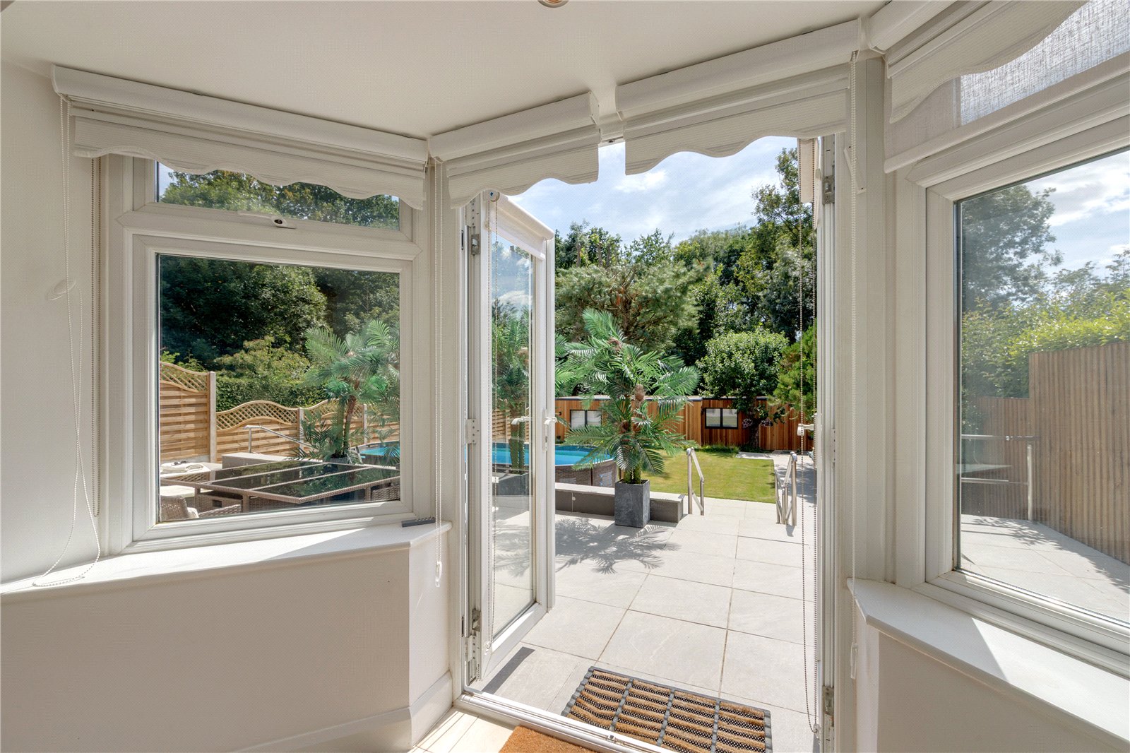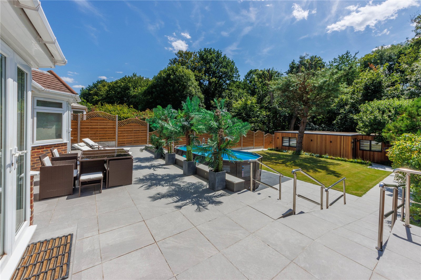 At the rear of the property, the beautifully landscaped south facing suntrap garden (with disabled access) offers a private sanctuary ideal for entertaining and relaxation. There is a substantial patio area with freestanding pool in the summer months, enhanced by mature greenery, rose bushes and shrubs while a beautiful lawn stretches toward a remarkable detached outbuilding. This impressive structure houses a vast cinema/games/entertainment room, complete with a WC and storage, providing endless leisure possibilities.