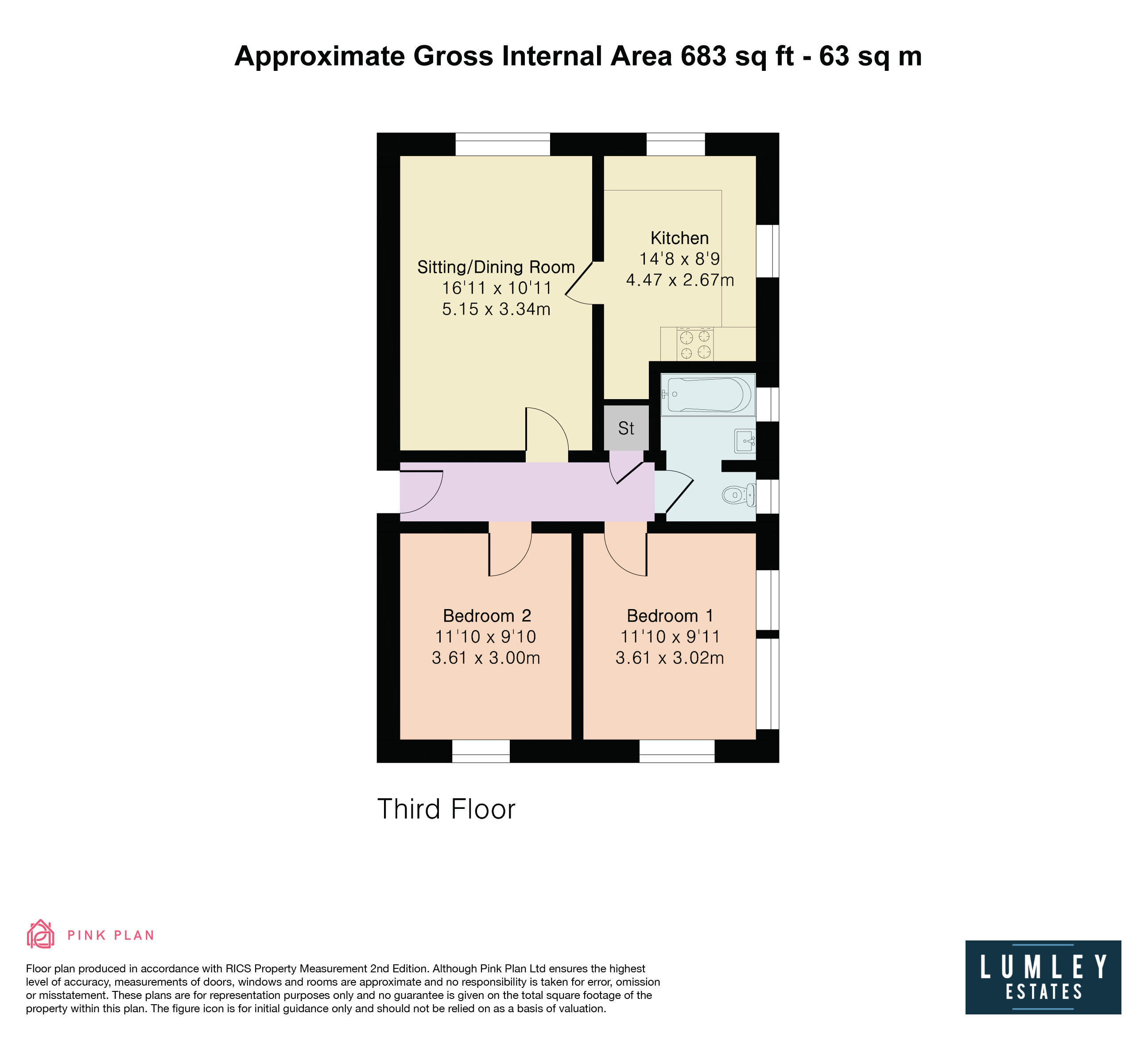 Situated on the top floor and located along Craigmount in Radlett, this well-proportioned two bedroom leasehold flat offers comfortable and practical living in a well-regarded residential area.The property provides approximately 683 sq ft of internal accommodation and is arranged around a welcoming central hallway with useful storage. To the front of the flat is a bright and spacious sitting and dining room, offering ample space for both relaxation and entertaining. Adjacent to this is a separate fitted kitchen, well laid out with good worktop and cupboard space.There are two generously sized bedrooms, both capable of accommodating double beds and bedroom furniture, making the flat ideal for professionals, small families or downsizers. The accommodation is completed by a family bathroom fitted with a bath, wash basin and WC.