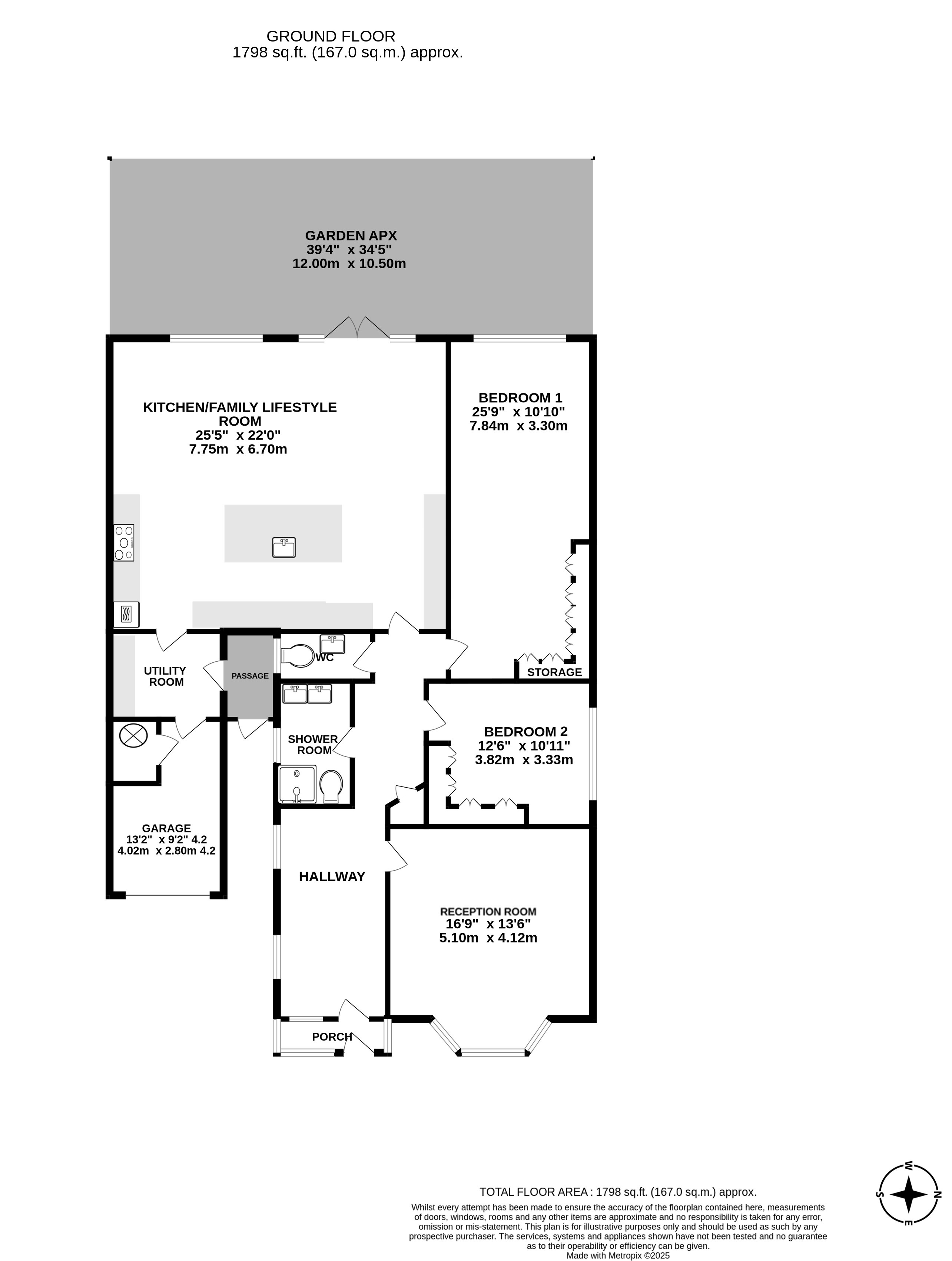 There is also a further reception which is bay fronted, ideal for a TV room.The home provides two well-proportioned bedrooms, including a principal bedroom of impressive size with ample natural light. Bedroom two is ideally positioned with fitted storage. A well-appointed shower room and additional WC complement the layout, ensuring convenience for family and guests alike.The property also benefits from a utility room, integral garage and further storage options, maximising practicality. To the rear, the delightful garden extends to approximately 39 ft by 34 ft and provides a private outdoor retreat.Positioned in one of Radletts sought-after residential roads, Links Drive, the bungalow is within easy reach of local amenities, excellent schools and Radletts mainline station with direct links to central London. This is a rare opportunity to acquire a home offering both generous space and modern comforts in a prime Radlett location.