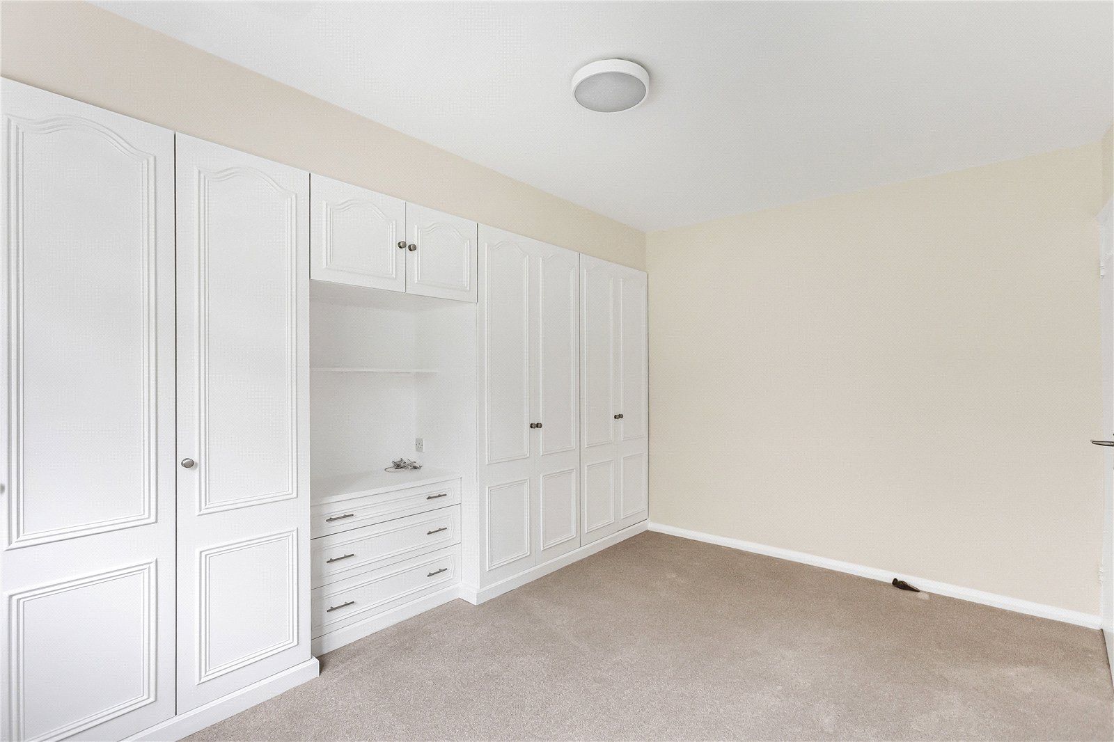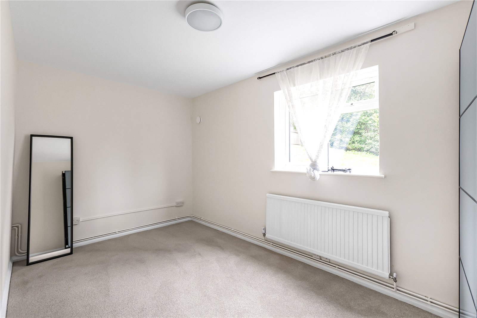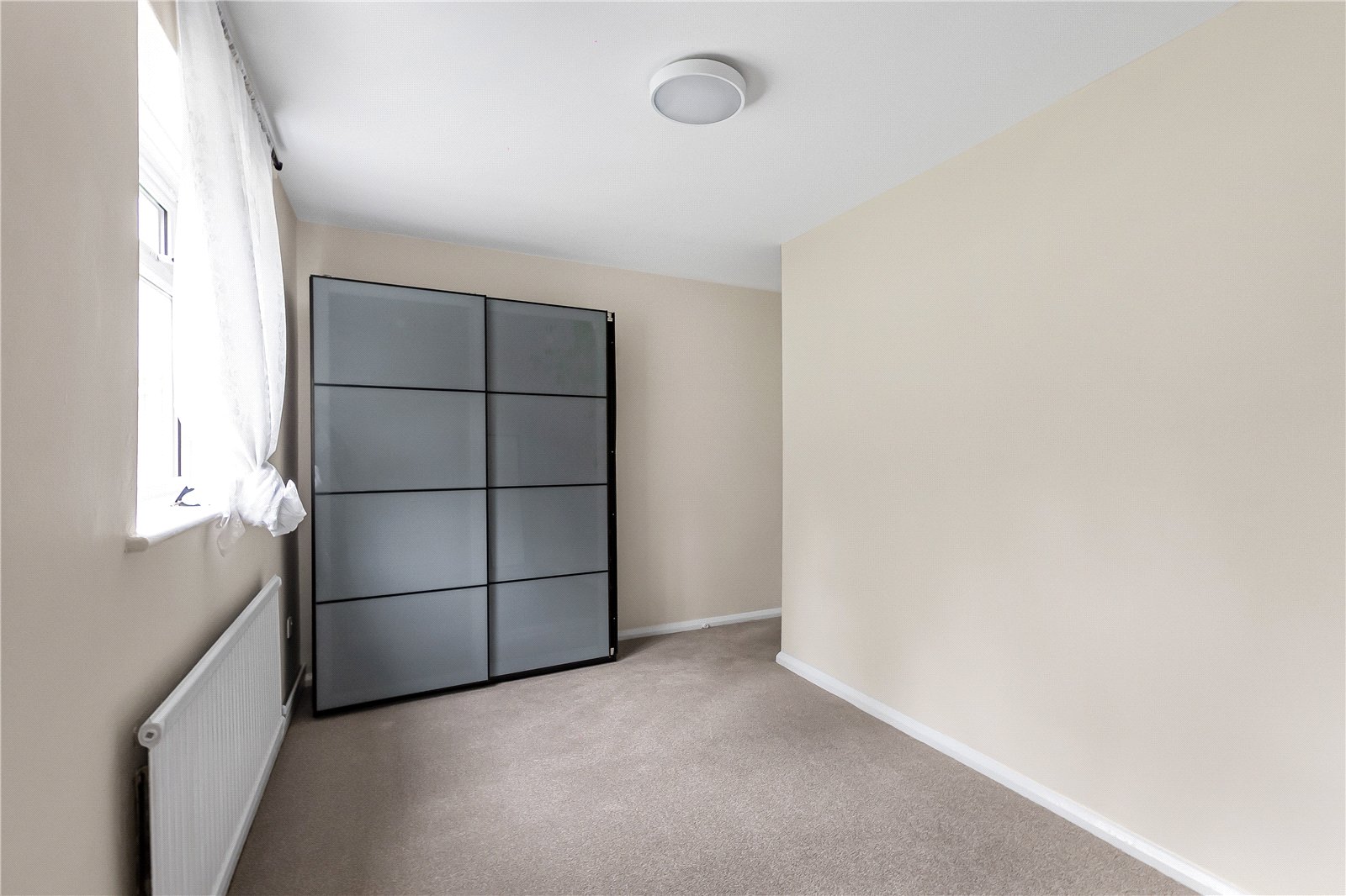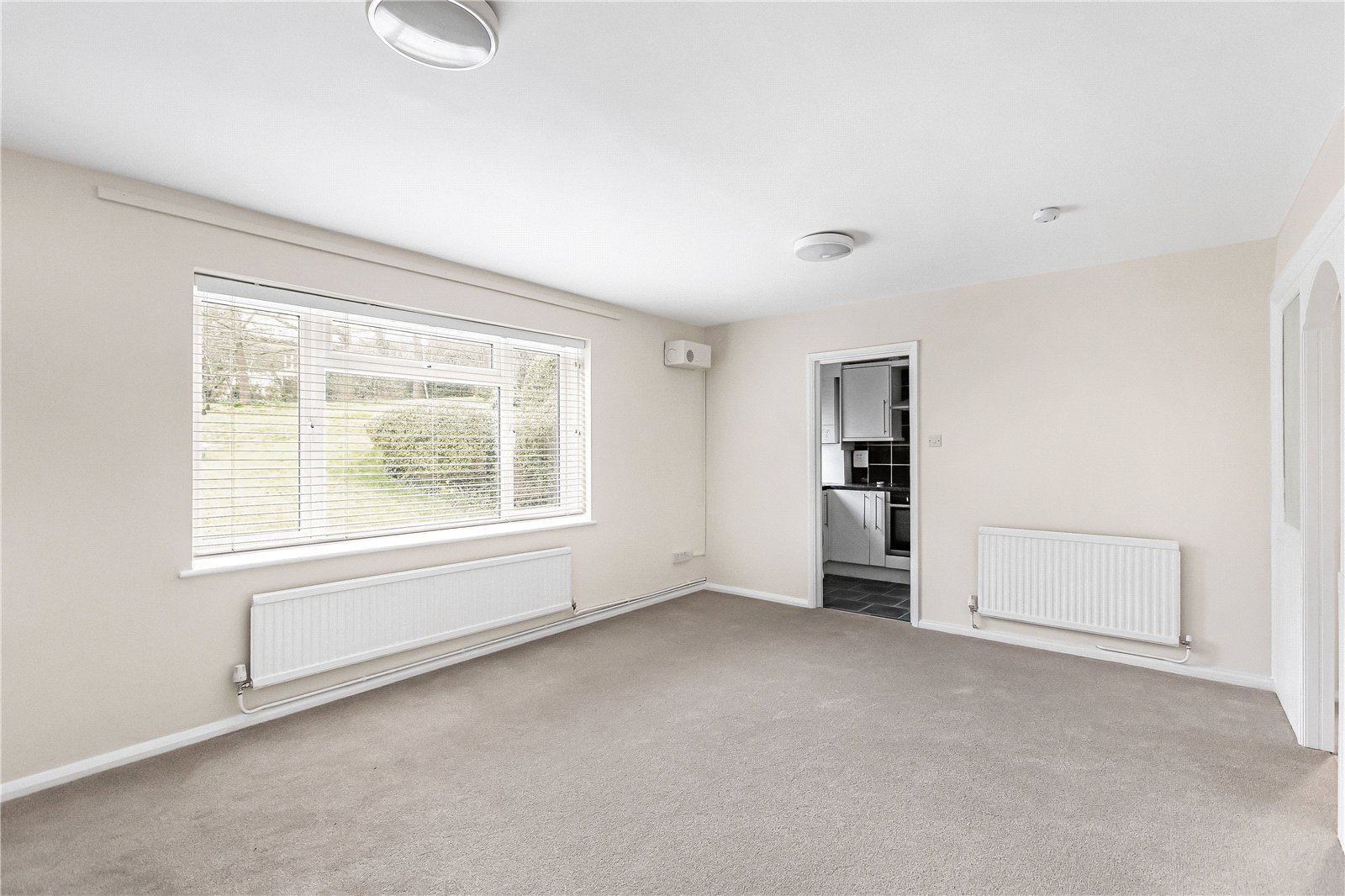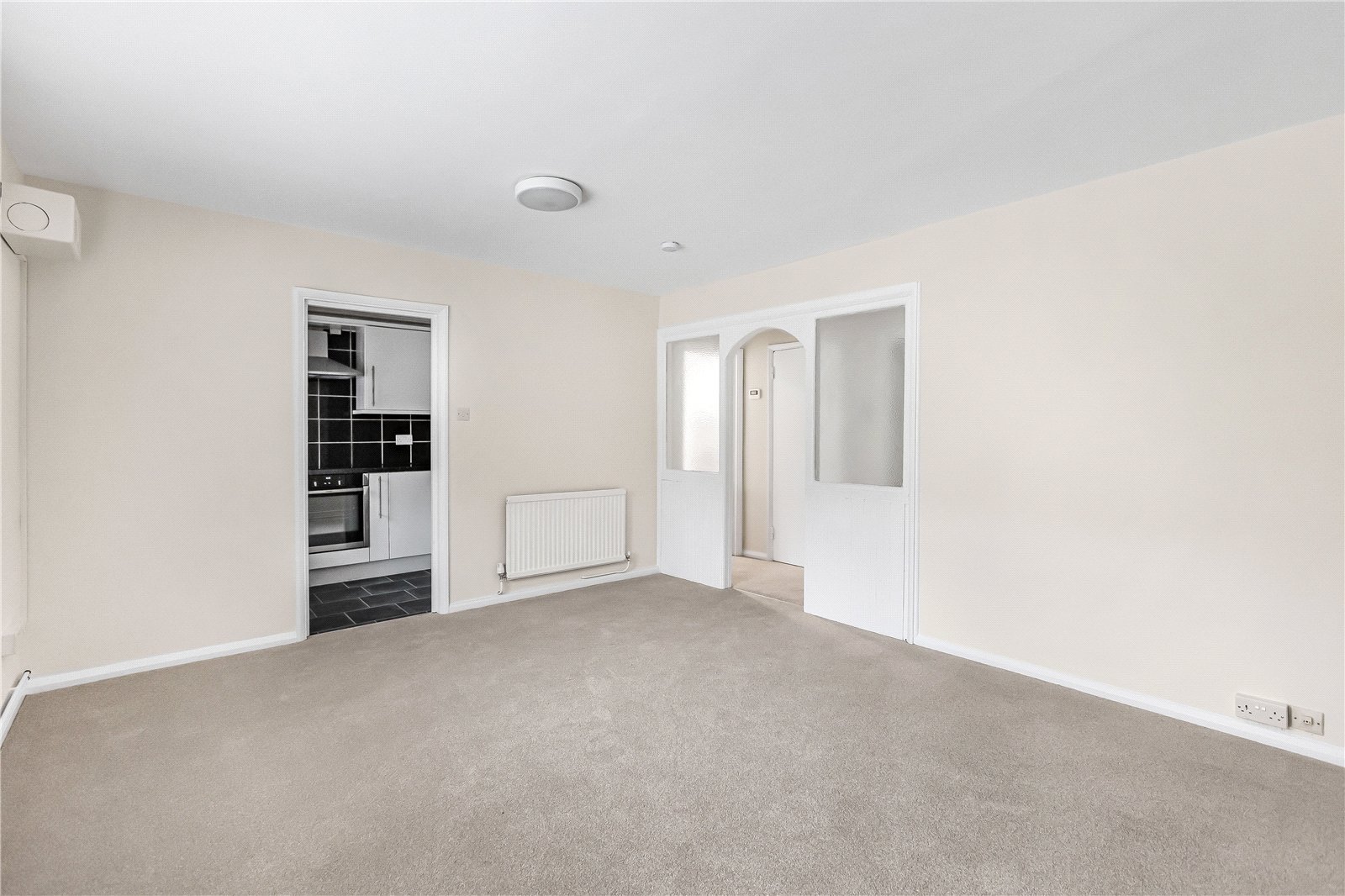 The property features a spacious and bright living room, with a kitchen conveniently connected, creating a practical and sociable layout. There are two generously sized bedrooms, with the principal bedroom benefiting from an extensive range of fitted wardrobes, providing ample storage.
