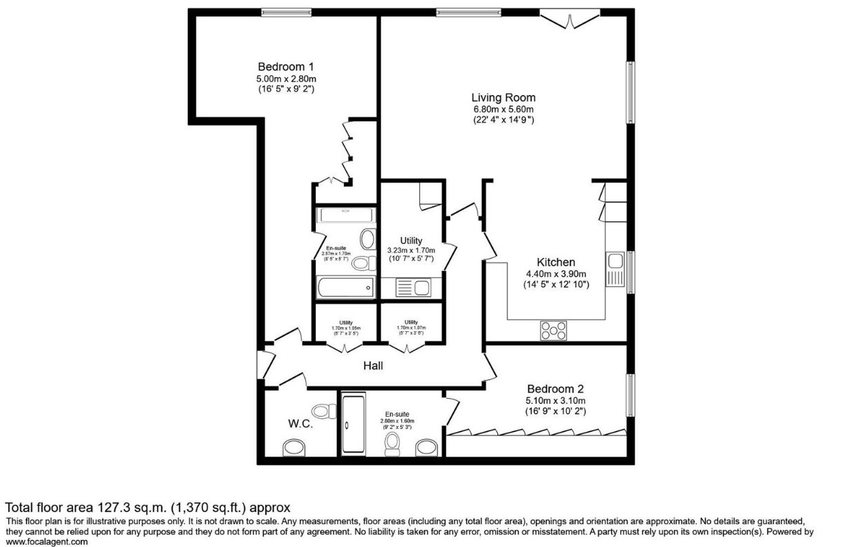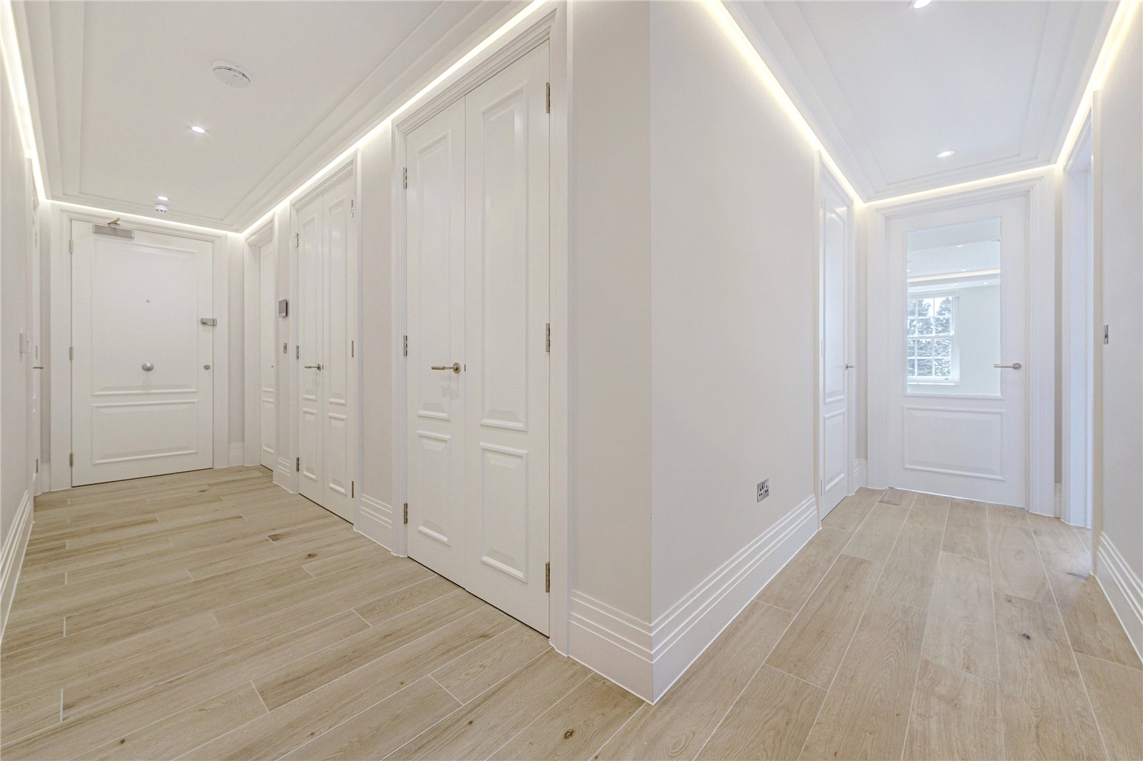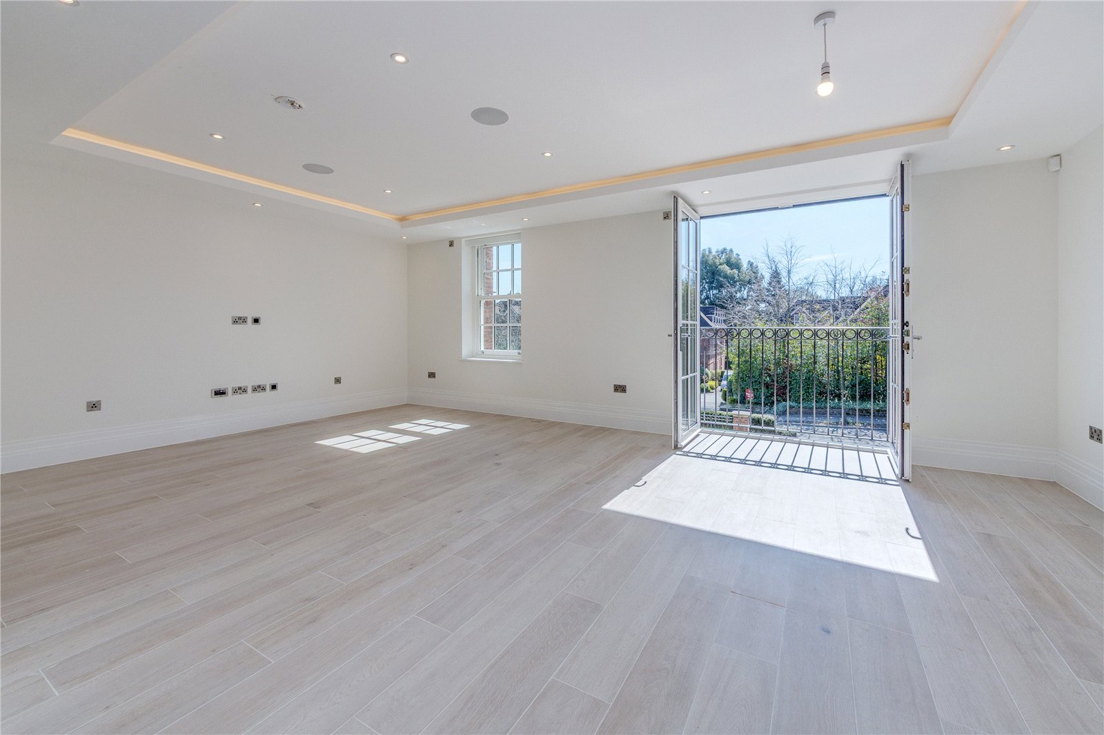 Designed to the highest specification, the property features underfloor heating throughout, a climate-controlled principal bedroom and top-of-the-range Miele and Siemens integrated appliances. Both bedrooms benefit from elegant en-suite bathrooms and both also include bespoke fitted wardrobes.