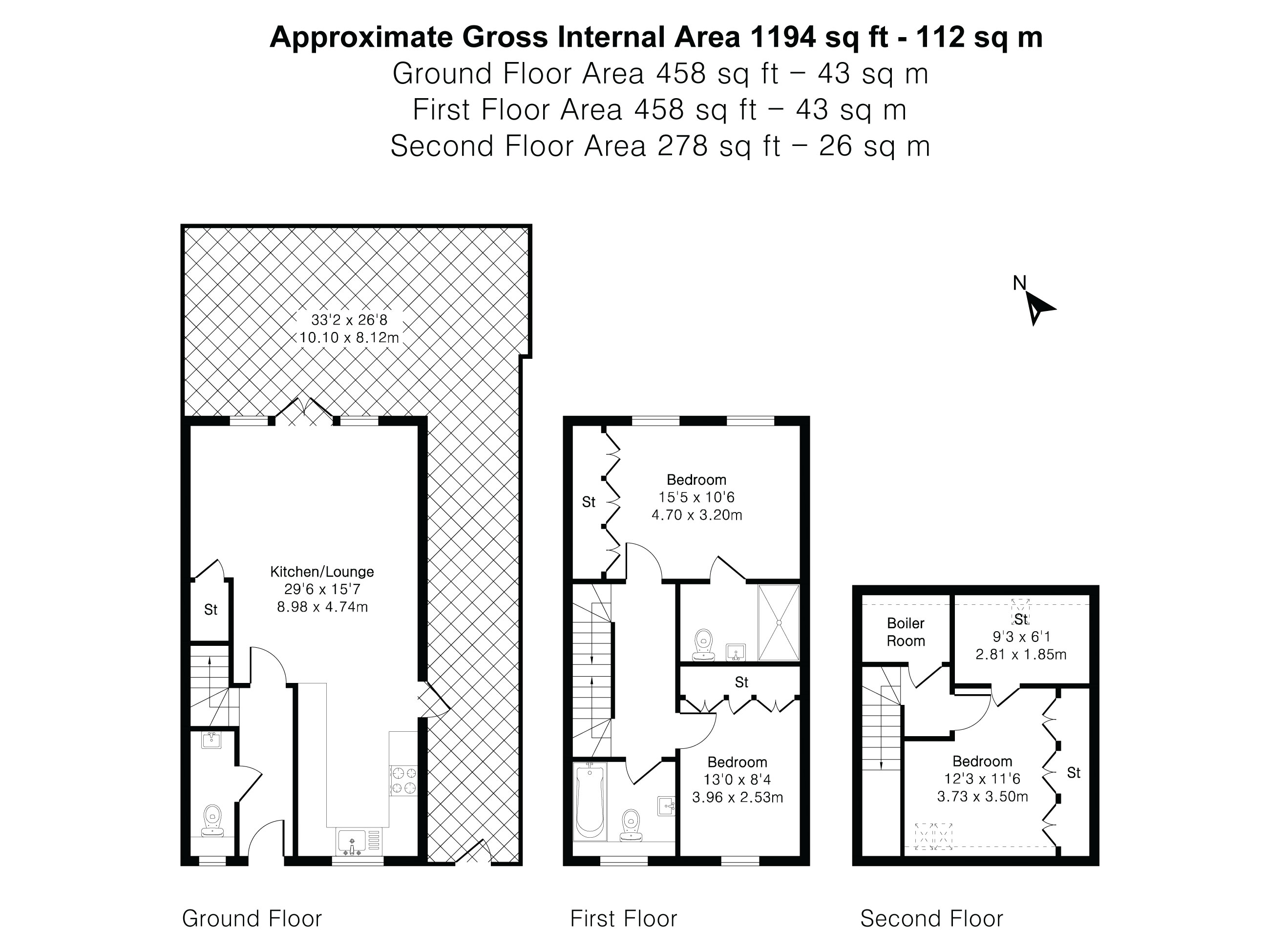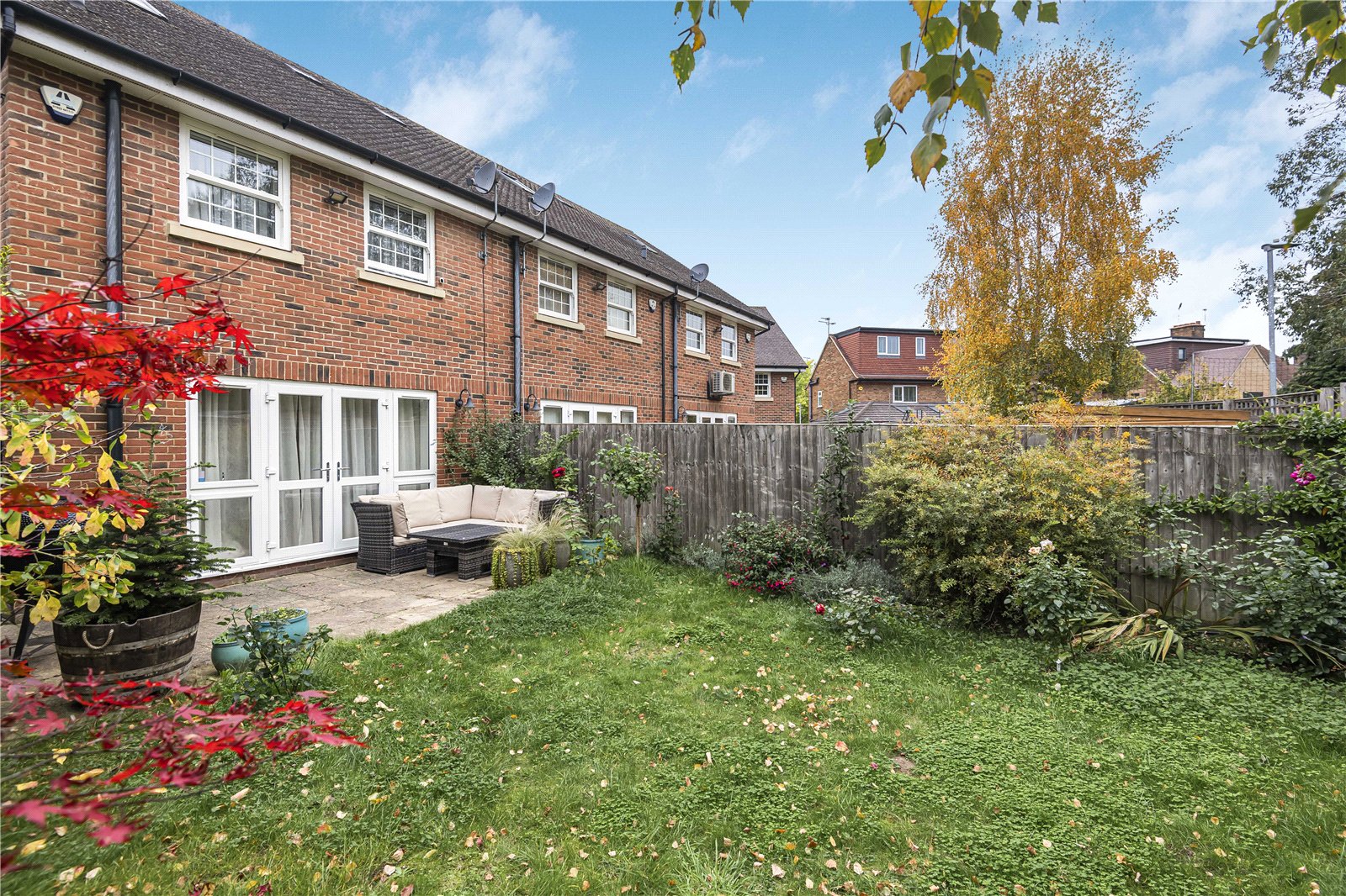 This attractive end-of-terrace home, constructed around 11 years ago by Shield Homes, is set within a peaceful mews development conveniently located for nearby shops, Radlett High Street, Radlett Thameslink Station and the Battlers Green shopping village. The property offers stylish, contemporary open-plan living throughout.The ground floor features a sleek, fully fitted kitchen complete with integrated appliances. To the rear, a spacious and light-filled reception area provides an ideal living and dining space, with French doors opening directly onto the garden.Upstairs on the first floor are two generously sized double bedrooms. The principal bedroom benefits from fitted wardrobes and a private en-suite shower room, while the second double bedroom is served by a modern family bathroom and also includes built-in wardrobes.The top floor offers an additional double bedroom along with two storage cupboards, one of which was formerly an en-suite shower room and could be reinstated.Externally, the property includes a storage cupboard to the front and three allocated parking spaces. The rear garden extends to approximately 34 ft, providing a pleasant outdoor space.
