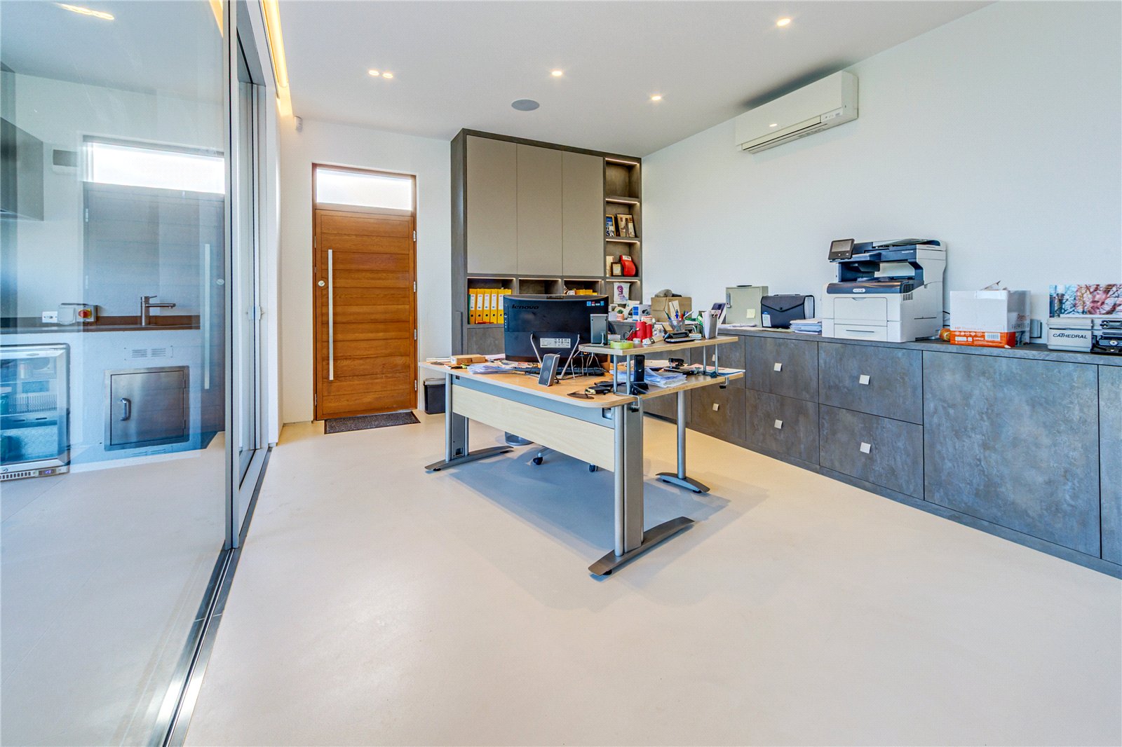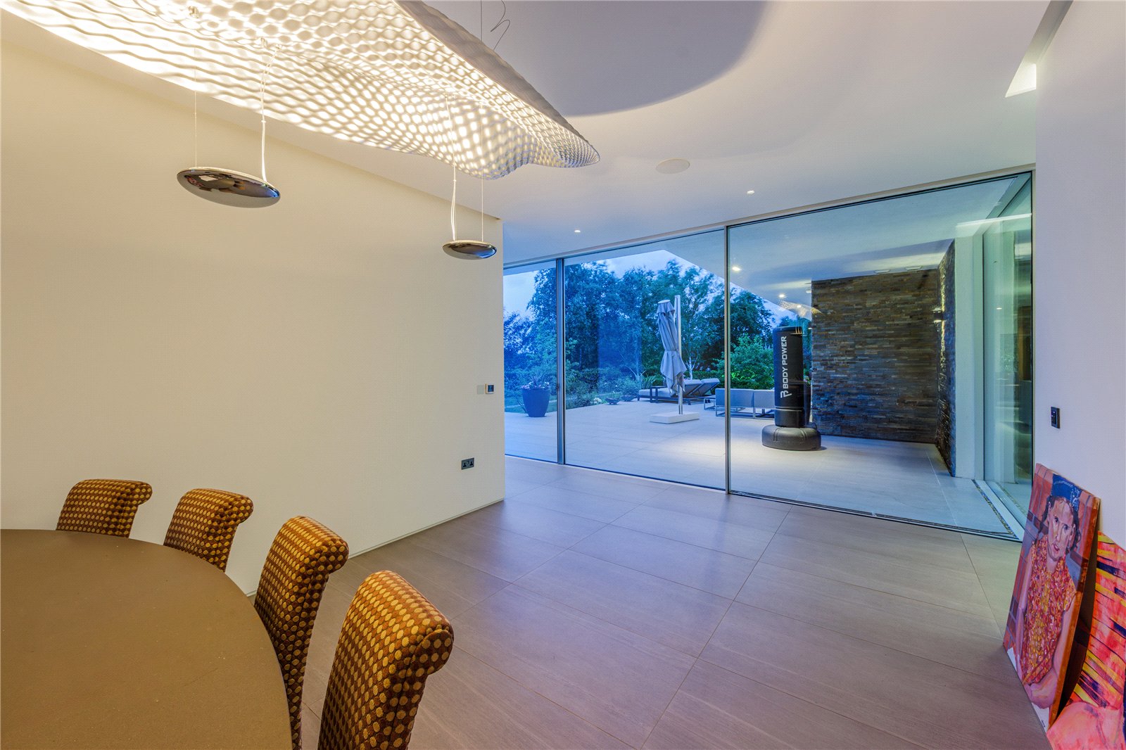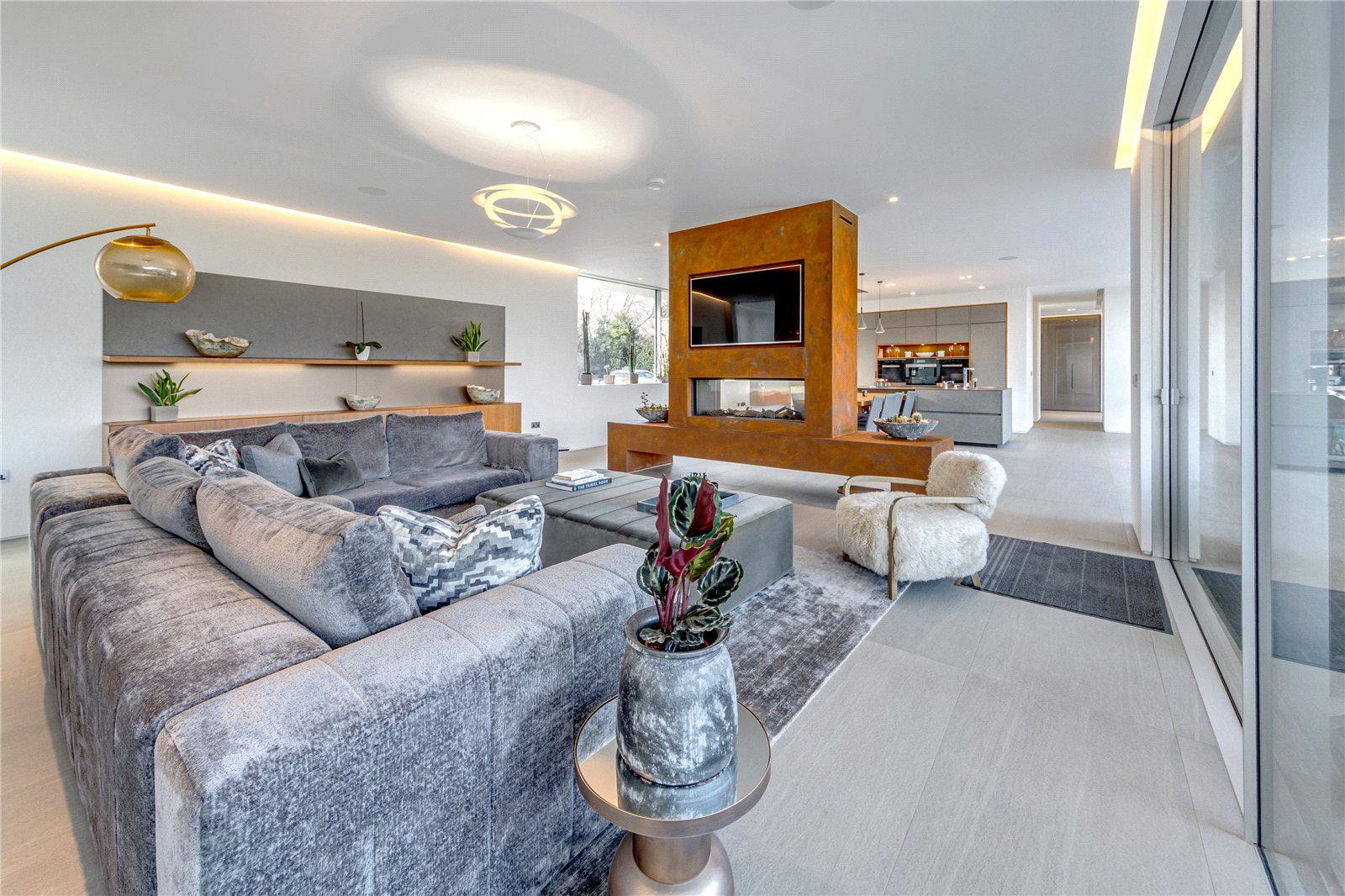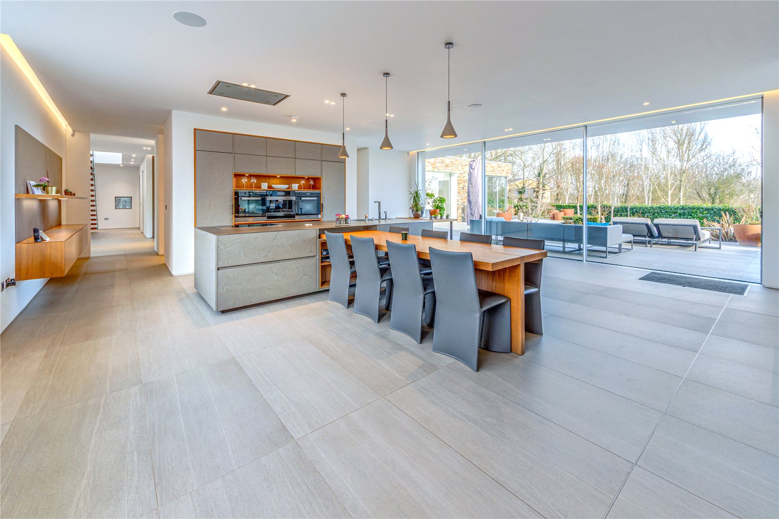 Upon entering the property, you are greeted by a spacious entrance hall that provides access to the heart of the home. The open-plan kitchen, family and lifestyle room is a breathtaking space, measuring an incredible 526 by 274. This beautifully designed area is perfect for entertaining and everyday family life, featuring a high-end kitchen with state-of-the-art appliances, a generous island and sleek contemporary finishes all flooded with natural light from the large floor to ceiling windows and sliding doors. Adjacent to this space, a covered barbecue area allows for seamless indoor-outdoor living, ideal for hosting guests or enjoying tranquil evenings.