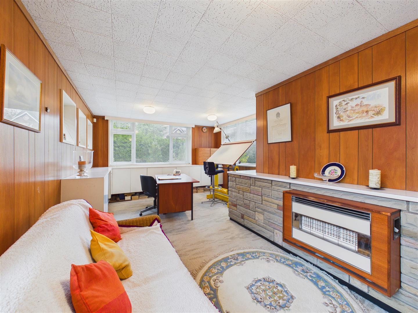 Bedroom 4/Study/Sitting Room - A room full of atmosphere having picture windows overlooking the rear garden. Having been formally a study, there is an array of fitted cupboards. Heating via way of storage heaters and a gas fire is set to a stone fireplace.