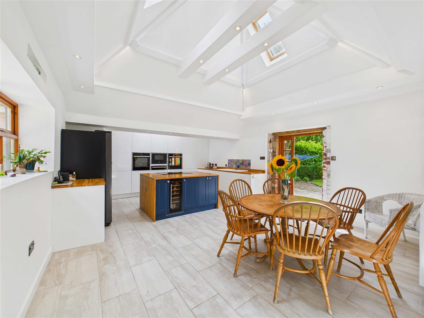 Dining Kitchen - 6.05m x 4.57m approx (19'10" x 15'0" approx) - A simply stunning room with its vaulted ceiling, window to courtyard and glazed door to the westerly facing garden. There is plenty of space for a variety of configurations to the room and the kitchen comprises an extensive range of dual toned contemporary units. A grand island holds a built in induction hob with integrated extractor and a wine chiller. Complimentary Neff appliances comprise two Hide and Slide ovens, combination microwave/grill, warming drawer and dishwasher. There is a ceramic one and a half bowl sink with mixer tap and water is supplied for the property through a water softener.