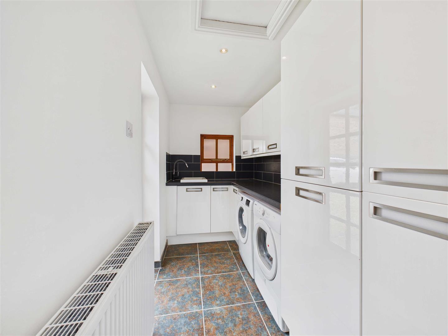Utility Room - 3.38m x 1.57m approx (11'1" x 5'2" approx) - With fitted units and work surfaces. Deep ceramic laundry sink and mixer tap. Plumbing for washing machine and space for dryer, tiling to floor, external access door to courtyard.