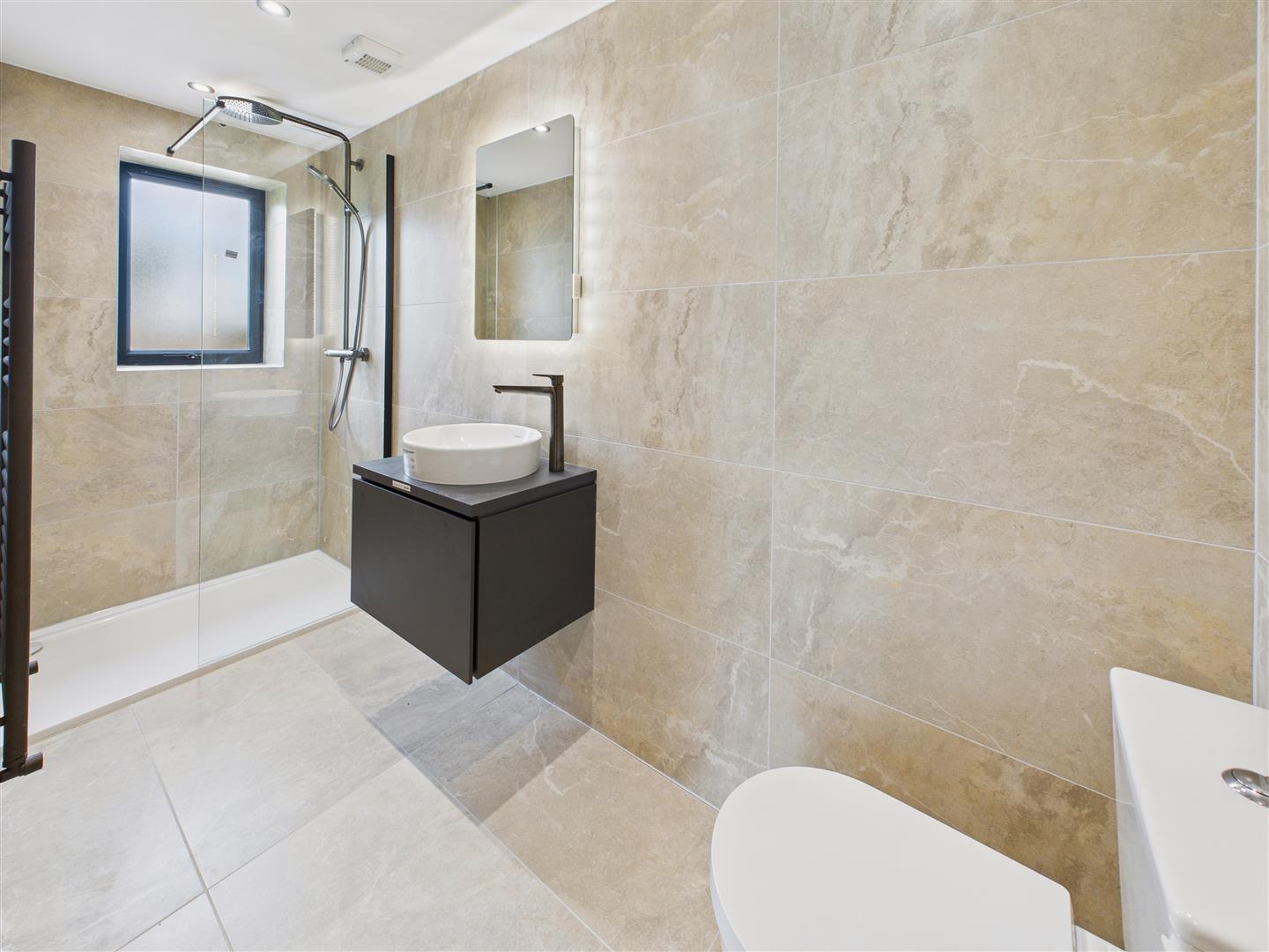 Shower Room - With low level W.C., circular Duravit wash hand basin on cabinet with mirror over, "walk in" shower area with glazed partition and rainhead and handheld shower system, fully tiled to walls and floor, heated towel rail.