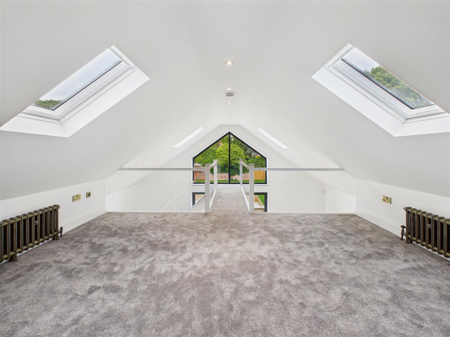 Mezzanine - A great space with a glazed gable overlooking the rear garden. A cosy area with sloping ceiling and inset Velux roof lights.
