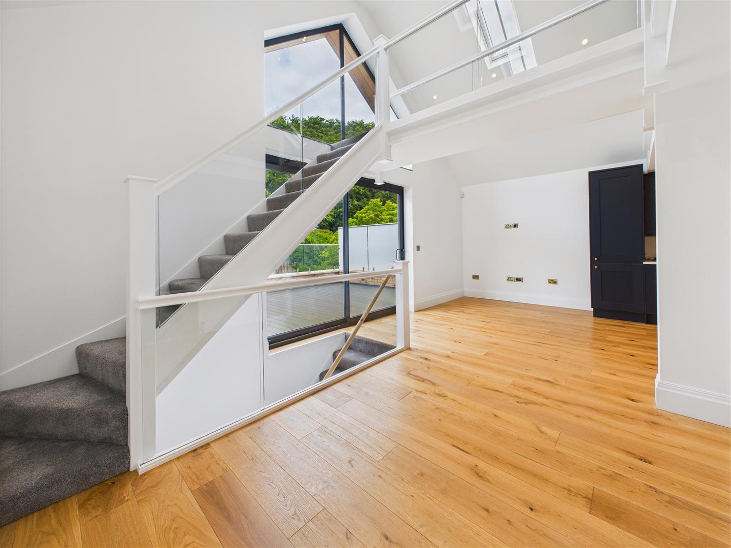 Open Plan Living/Dining/Kitchen Area - A simply stunning contemporary space which provides an amazing view to the rear through sliding patio doors which open out to a private decked terrace overlooking the rear garden The kitchen is fitted with a stunning range of high spec units with quartz work surfaces. There is an undercounter one and a half copper sink with a professional style mixer tap. Integrated appliances include a double oven, induction hob with extractor above, 60/40 fridge freezer, dishwasher and washer dryer. Concealed gas fired central heating boiler. With high ceiling having beautiful coving and ceiling rose. Glazing system to rear with double doors opening out to a terrace. The room provides plenty of space for dining suite and settees etc. and a further staircase leads up to the mezzanine floor.