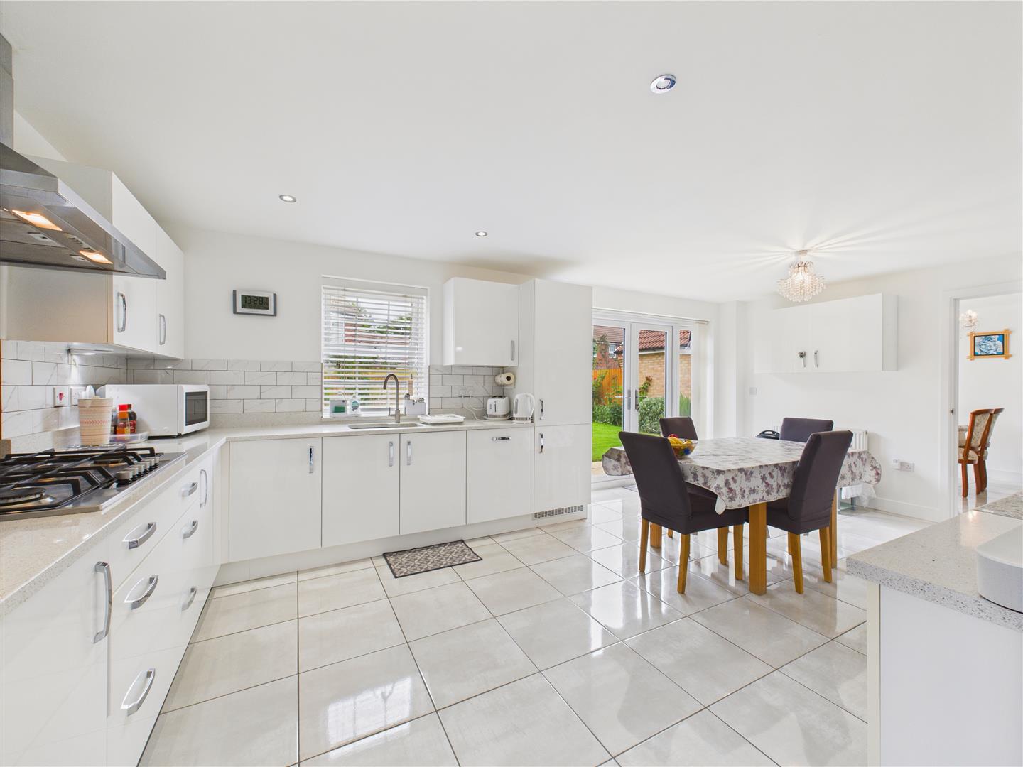 Dining Kitchen - Having a range of stylish base and wall units with sleek granite worktops incorporating an under counter sink with mixer tap and tiled splashbacks. Integrated appliances include a double oven, six ring gas hob with extractor above, fridge/freezer and dishwasher. Inset spot lights, tiled floor and French doors to the rear garden.