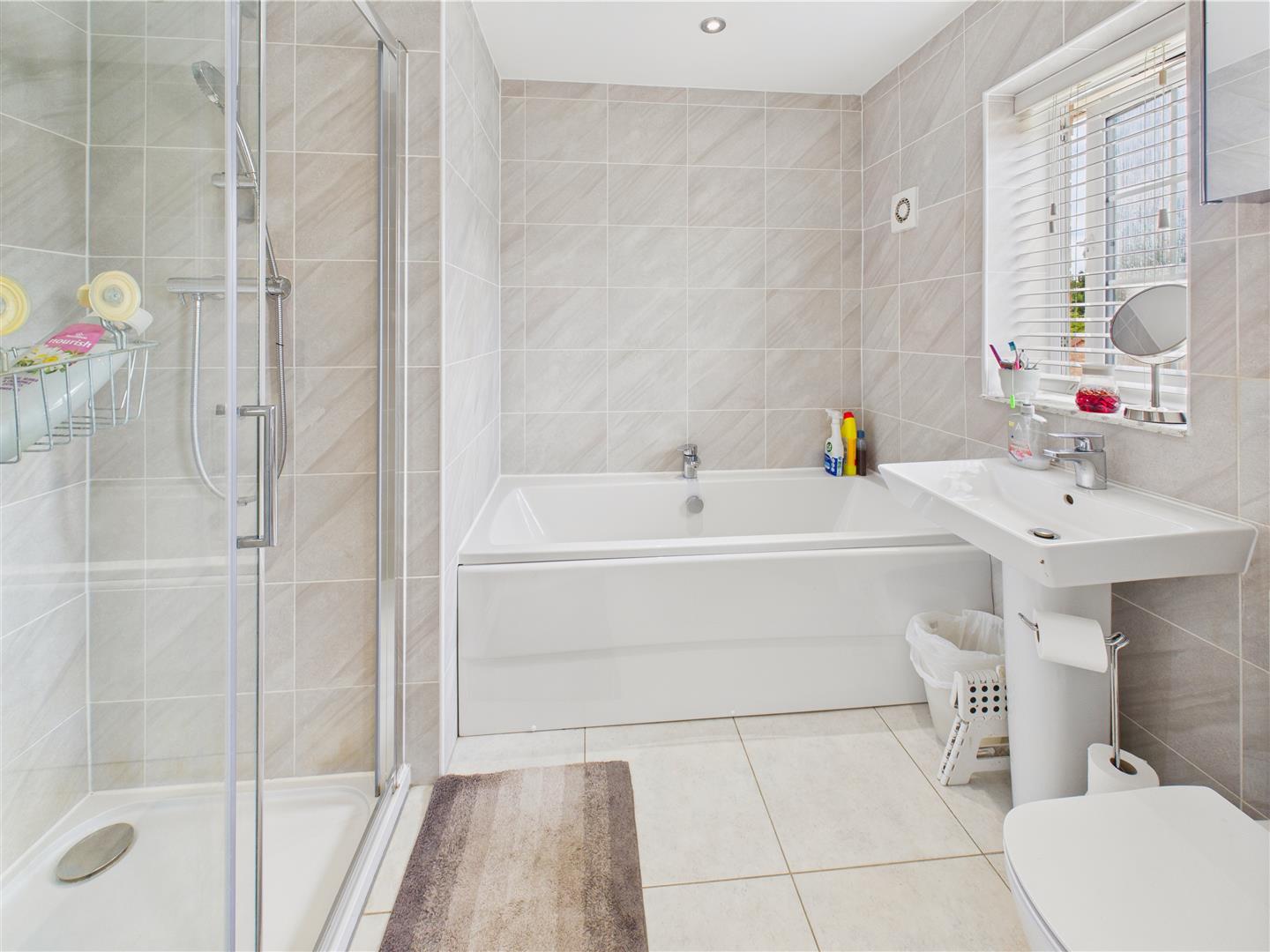 Family Bathroom - With suite comprising a bath, shower enclosure, wash hand basin and low flush W.C. Fully tiled to walls and floor, window to side.