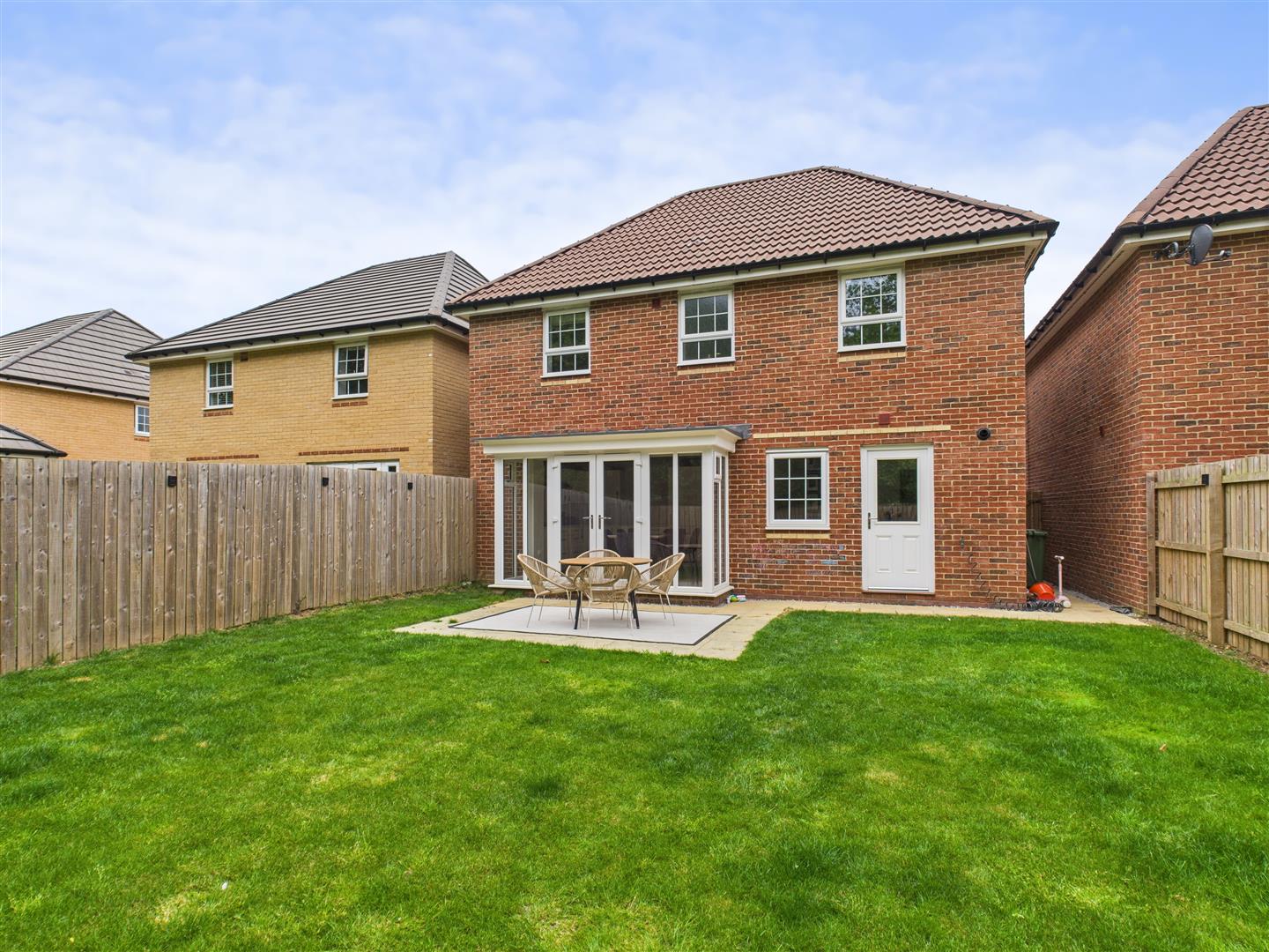 Outside - Outside, there's a front lawn and a double driveway leading to the integral garage. The rear garden benefits from a sunny southerly aspect and is mainly lawned with a patio for outdoor relaxation, all enclosed by fencing.