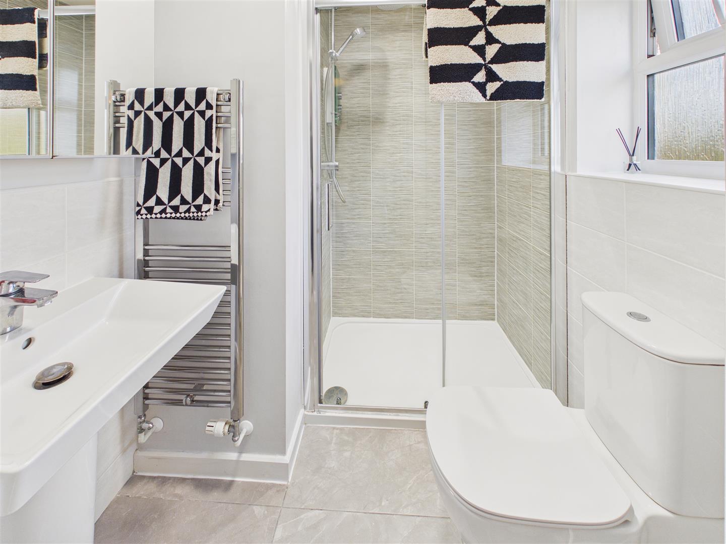 En-Suite Shower Room - With a shower enclosure, low-flush W.C. beneath window to the front elevation and wash-hand basin. Tiled flooring and surround.