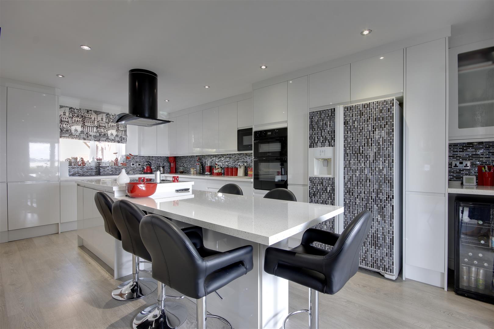 Dining Kitchen - 5.99m x 3.40m approx (19'8" x 11'2" approx) - Having an extensive range of modern base and wall units with under cupboard lighting, laminate worksurfaces and a matching central island incorporating a dining table with six chairs. There is a sink and drainer with waste disposal unit, double oven, induction hob with extractor above, dishwasher, microwave, washing machine and wine cooler. A large storage cupboard is located under the stairs. Double doors open through to the sun room.