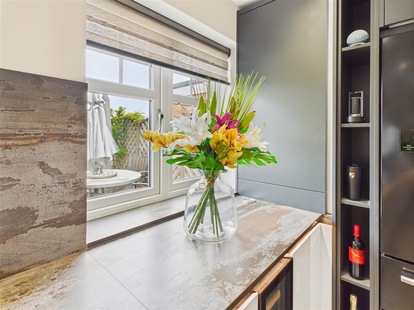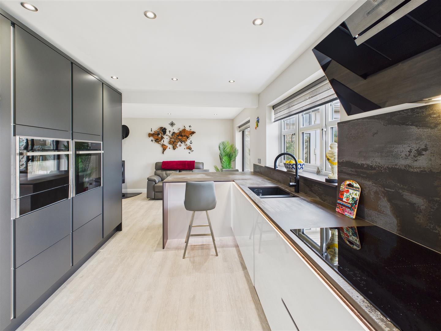 Living Kitchen - This space has a real 'wow' factor. The owner has made a significant investment and created a simply stunning space with area to lounge/dine together with a kitchen which has an extensive range of high quality units. The stunning range of dual toned units are complimented by Dekton work surfaces and a breakfast bar return. Features include twin Neff ovens, warming drawer, 5 ring induction hob with extractor hood above, microwave, dishwasher, wine chiller and a housing for a fridge freezer. There is a Quooker instant hot water tap to the undercounter sink. Two windows overlook the rear garden with automated blinds and sliding patio doors provide access to the conservatory. To one corner of the room is a stunning log burner ideal for those cosy winter nights.