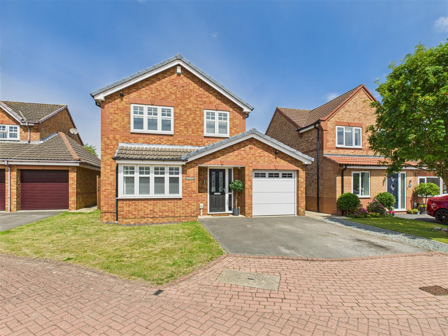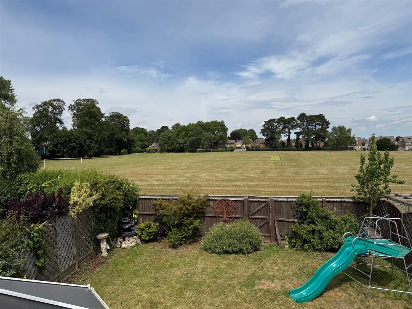 Outside - A lawned garden extends to the front with a twin width driveway providing access to the garage which has an automated up and over entry door. The enclosed rear garden has a paved patio area and lawn bounded by shrubs. A particular feature is the fact that the property adjoins a playing field to the rear therefore is not directly overlooked.