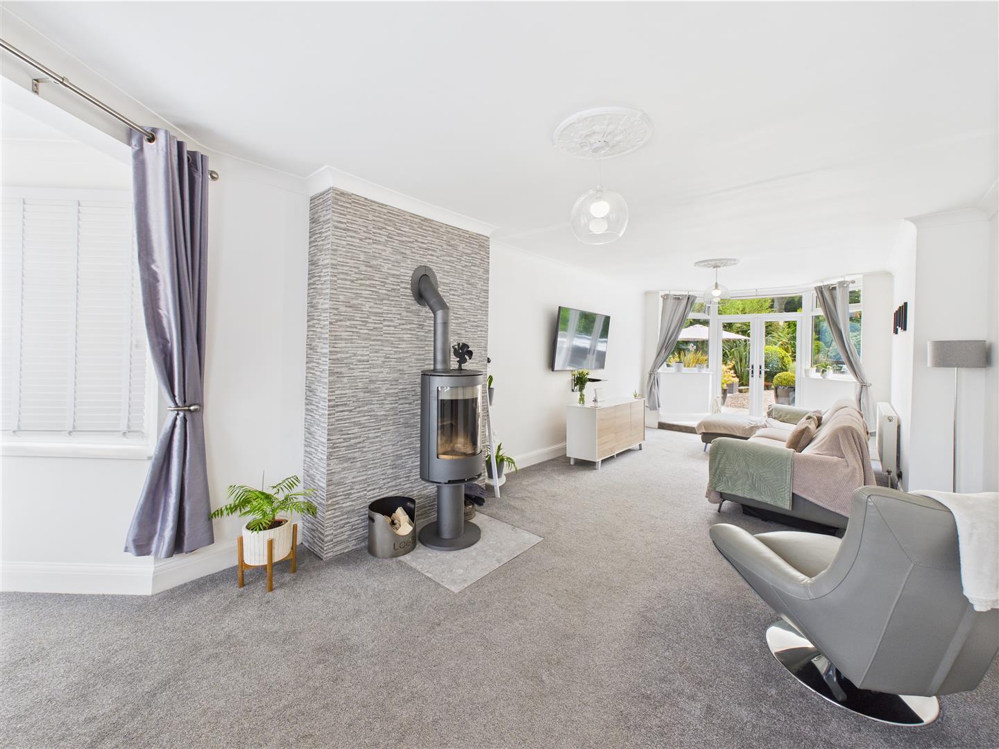 Lounge - A stunning room with light flooding in through a window and corner bay to the front plus bay to the rear with central doors opening out to the patio. The focal point of the room is a floor mounted log burner and tiled chimney breast.