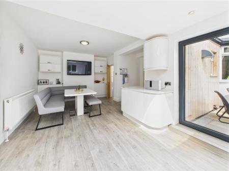 Living Kitchen - A superb room with sleek modern units complete with quartz tops including and undercounter sink and professional mixer tap. There is a range style cooker, extractor hood above., dishwasher. Plenty of space for dining and relaxing, wall mounted TV point. Bi fold doors open out to the rear garden and further window looks down the garden. A lantern light also allows light to flood in.