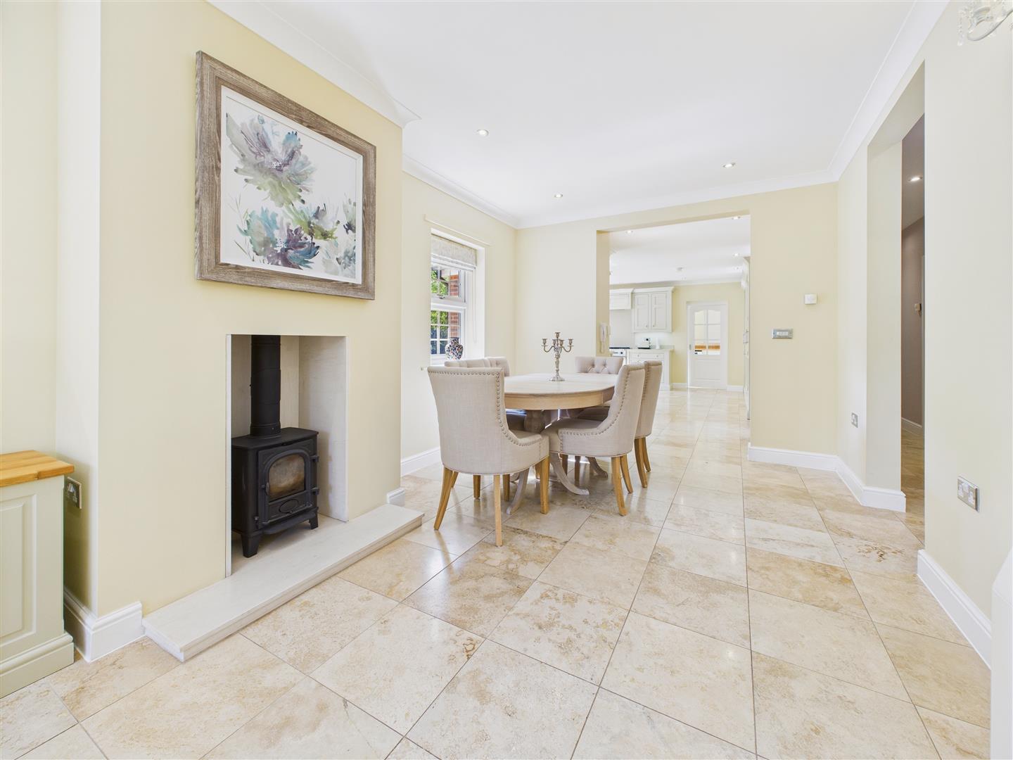 Reception/Dining Area - With windows to the front and side, chimney breast housing a log burner, recessed downlighters to the ceiling and travertine flooring. The room is open plan in style and leads through to the kitchen.