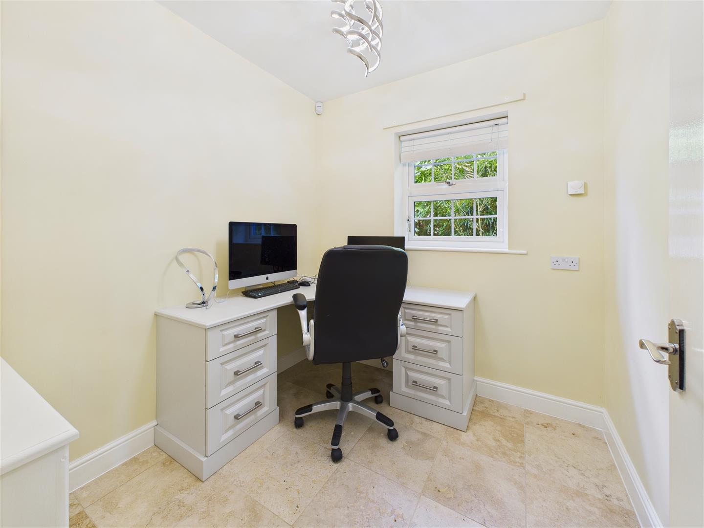 Study - With travertine flooring, a fitted desk unit to the corner and window to the side elevation.