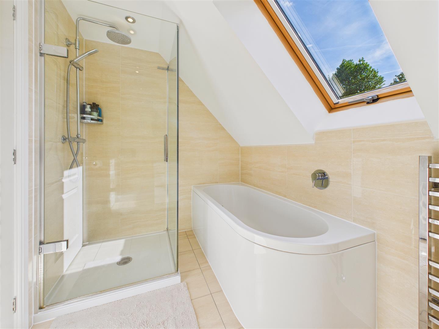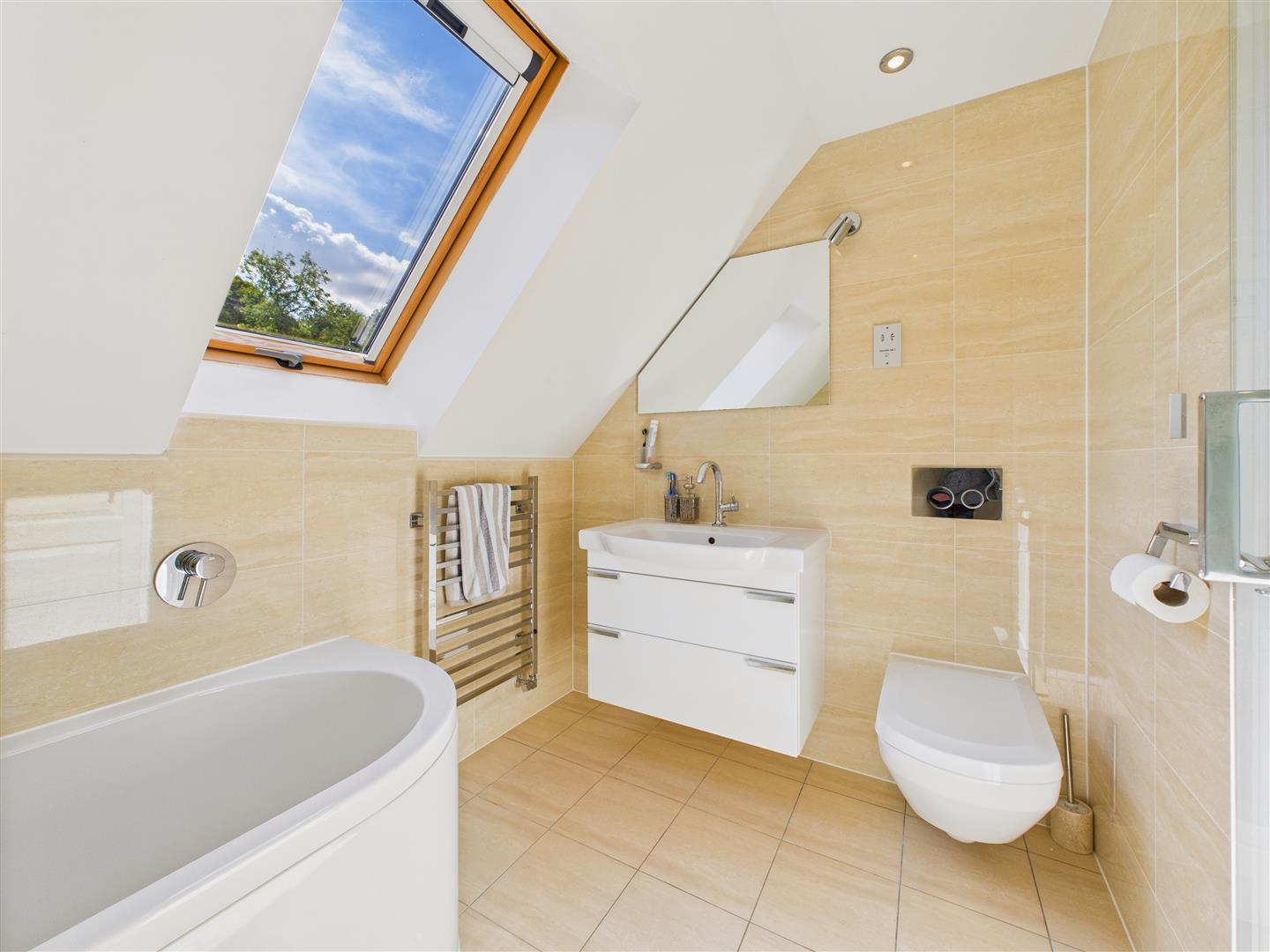 Bathroom - Fitted by Aquarius of Howden, comprising Villeroy & Boch wash-hand basin atop vanity unit, concealed-flush W.C., heated towel rail, bath and shower enclosure with tiled flooring and surround.